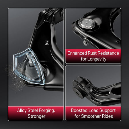 【Control Arm Features】 The control arm improves stability, handling, and driving comfort, with a protective finish that helps extend service life. Made from forged alloy steel, it delivers reliable performance, reduces noise, and ensures accurate fitment for safe and consistent driving