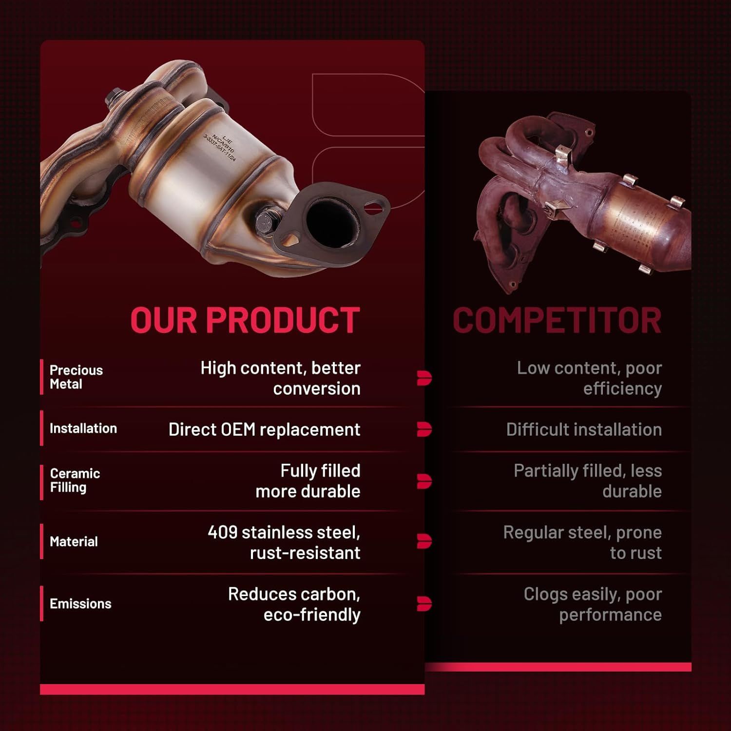 【High Quality】The catalyst converter body Made of high quality stainless steel, with better high temperature resistance, oxidation and corrosion resistance, sturdy for long service time. contains Platinum, Rhodium, Palladium rare metals to catalyze harmful tail gases to zero efficientl, to enhance purification efficiency and intensity, Compliant EPA standards. Direct-fit compatible with original equipment, ensuring seamless installation.