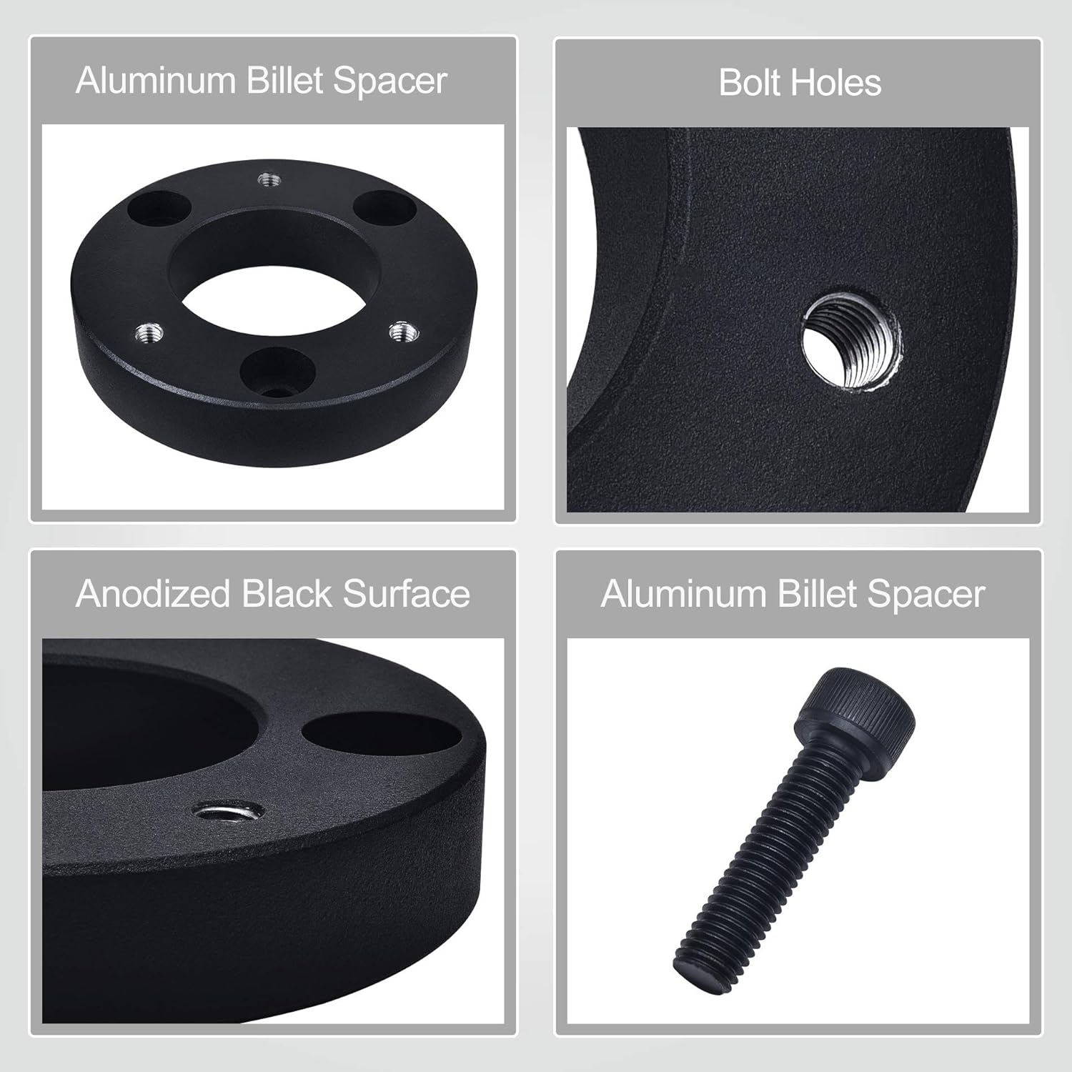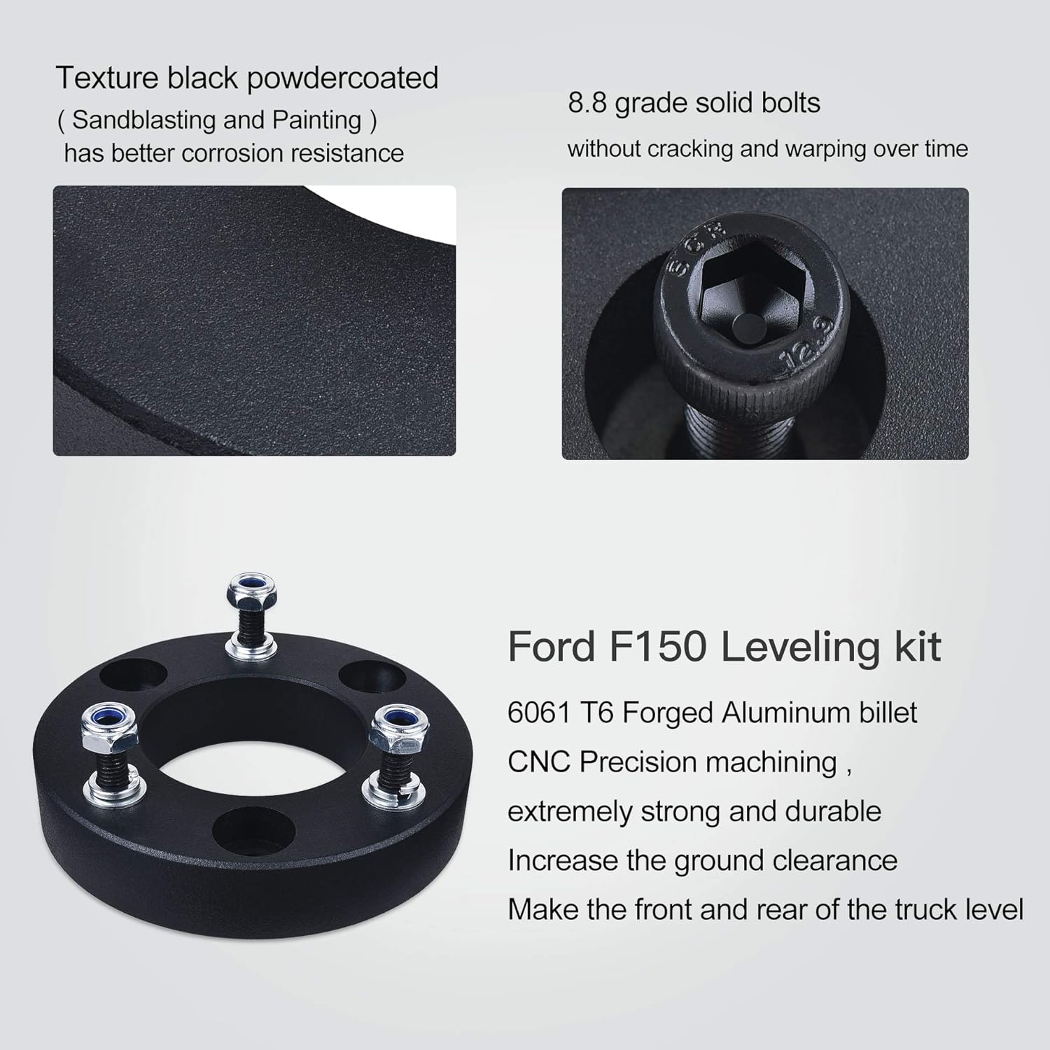 F150 Suspension kit are CNC precision machined out of forged 6061 T6 aluminum, the adapter specially powder black coated for a great look that will offer better corrosion resistance and last the life. 12.9 grade solid bolts extremely strong and durable without compressing or warping over time.