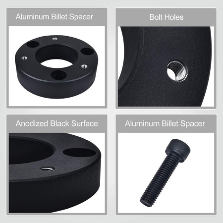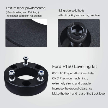 F150 Suspension kit are CNC precision machined out of forged 6061 T6 aluminum, the adapter specially powder black coated for a great look that will offer better corrosion resistance and last the life. 12.9 grade solid bolts extremely strong and durable without compressing or warping over time.