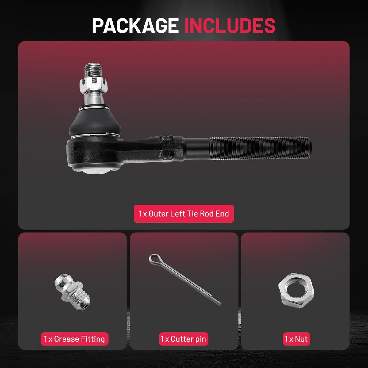 【Tie Rod Ends Kit Include】1 x ES3366T Front Outer Left Tie Rod End, 1 x Grease Fittings, 1 x Cutter pins, 1 x Nuts.