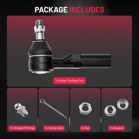 【Tie Rod Ends Kit Include】1 x ES3538 Front Outer Tie Rod End, 1 x Grease Fittings, 1 x Cutter pins, 1 x Nuts, 1 x Gasket.