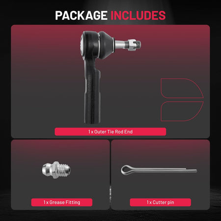 【Tie Rod Ends Kit Include】1 x ES3459 Front Outer Tie Rod End, 1 x Grease Fitting, 1 x Cutter pin.