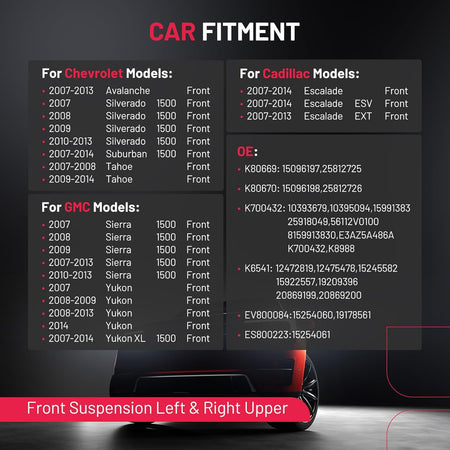 [Products contain] 1*Front Upper Left Control Arm w/ Ball Joint - K80669 1*Front Upper Right Control Arm w/ Ball Joint - K80670 2*Front Sway Bar Stabilizer Links - K700432 2*Front Lower Ball Joints - K6541 2*Front Inner Tie Rod Ends - EV800084 2*Front Outer Tie Rod Ends - ES800223