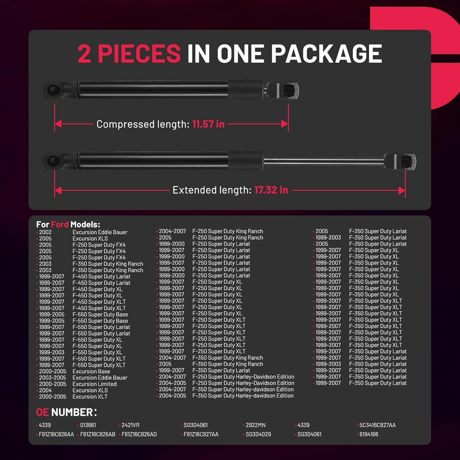 【Hood Lift Support】 BDFHYK lift supports are compatible with 1999-2007 F-250/ 1995-2007 F-350/ 1999-2005 F-450/ 1999-2005 F-550/ 2000-2005 Excursion. It has 2 items in one set and installs at front hood. The support is Exactly fitting for OE products.