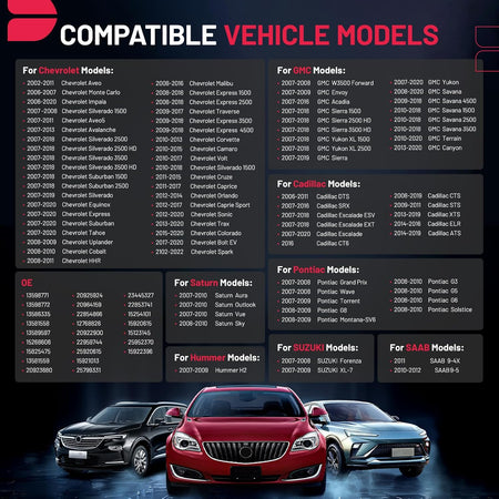Fitment: This 100% brand new tire pressure monitor system (TPMS) is compatible with most GM branded vehicles manufactured after 2006, Compatible with Cadillac CTS DTS, Compatible with Chevy Silverado, GMC Sierra, Buick Cascada, Pontiac, Compatible with Saturn, and more. Please refer to the product description below for the complete list of compatible models and years or you can also use Amazon's part finder tool to enter your car's year, make, and model to confirm compatibility.
