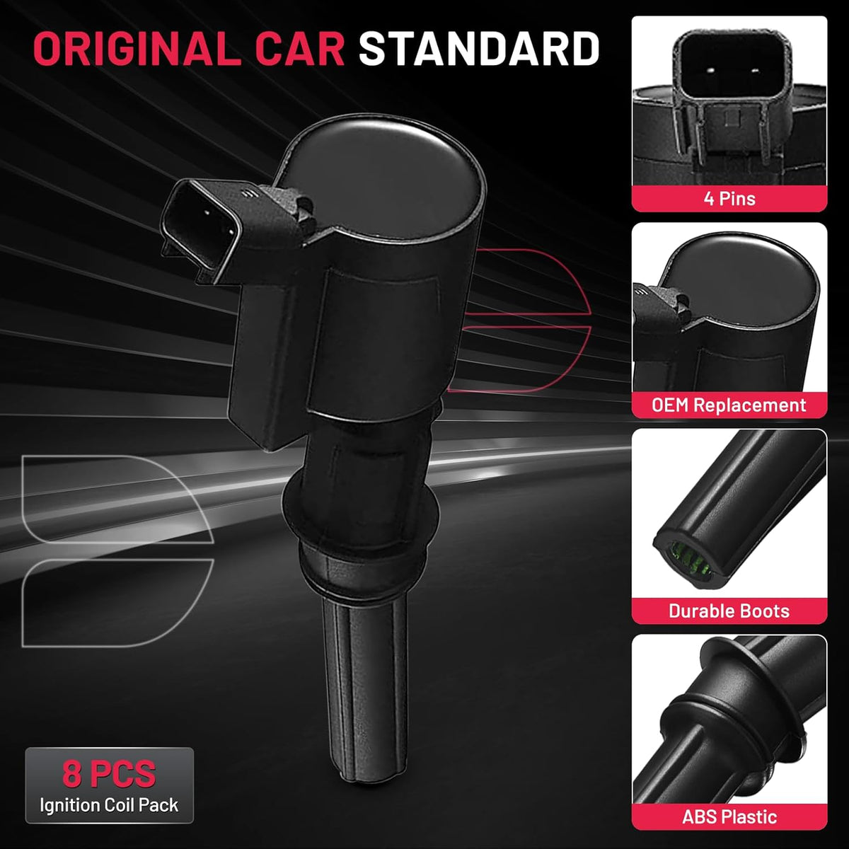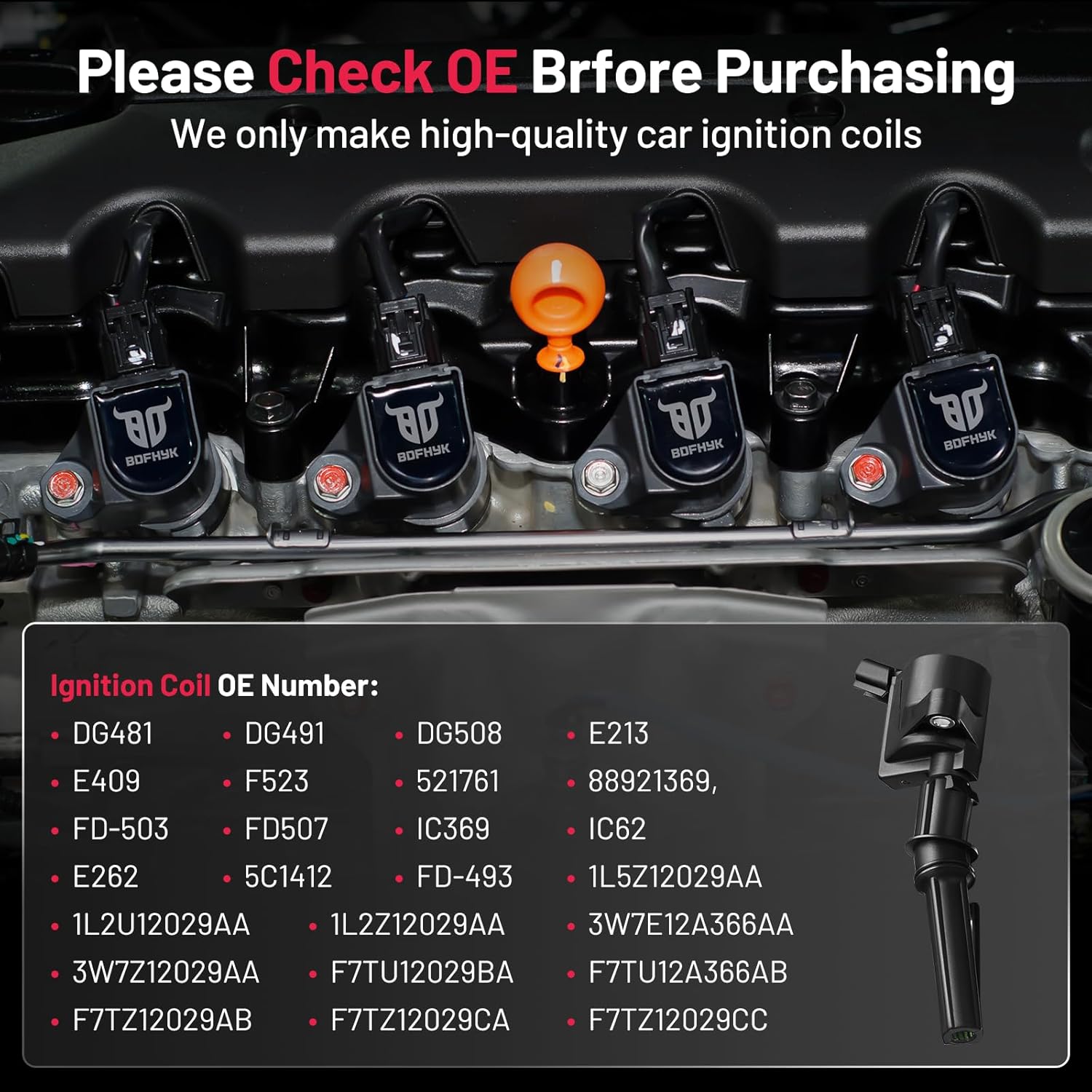 【Compatible OEM Part Numbers:】Coil packs compatible to DG508, DG481, DG491, FD493, FD503, FD507, F523, 5C1412, E213, E262, E409, 521761, IC369, IC62, 1L2U12029AA, 1L2Z12029AA, 1L5Z12029AA, 3W7E12A366AA, 3W7Z12029AA, F7TU12029BA, F7TU12A366AB, F7TU12A366BA, F7TZ12029AB, F7TZ12029BA, F7TZ12029CA, F7TZ12029CC, 88921369.