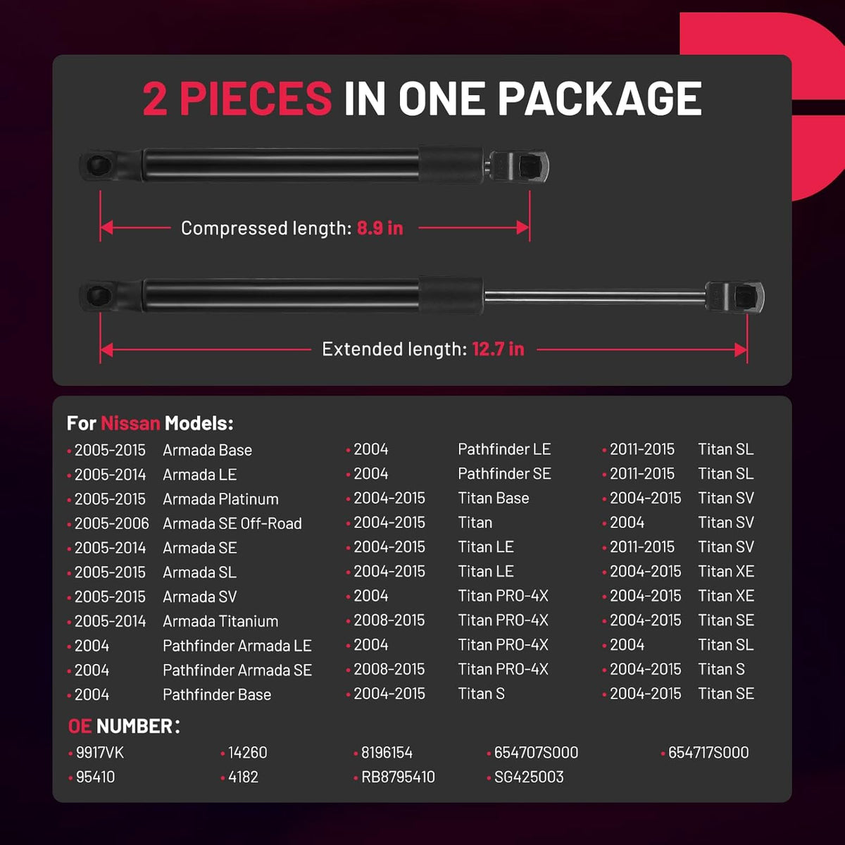 【Basic Info.】BDFHYK hood lift supports are compatible with Nissan 2005-2015 Armada, 2014 Pathfinder and 2004-2012 Titan. It has 2 items in one set and installs at front hood.Gas struts are 9.25in compressed and 13.58in extended.No ball studs.