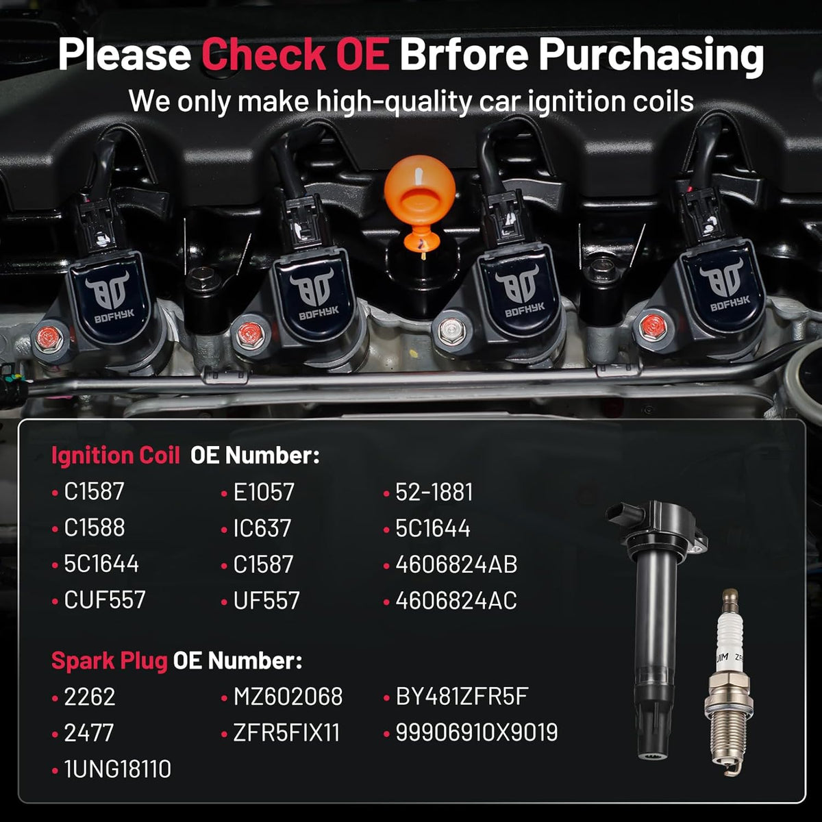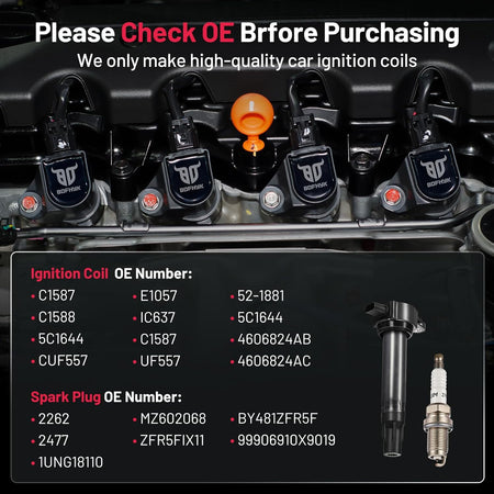 【Yes, you need a new one!】If your car has been used for a long time(over 80000km) and has problems like car shaking, start-up failure, speeding up slowly, and increasing fuel consumption, you may need to change a new set of spark plugs and coil packs. BDFHYK ignition coil and spark plug can offer you a professional user experience and make your car like new. You may choose it with confidence.