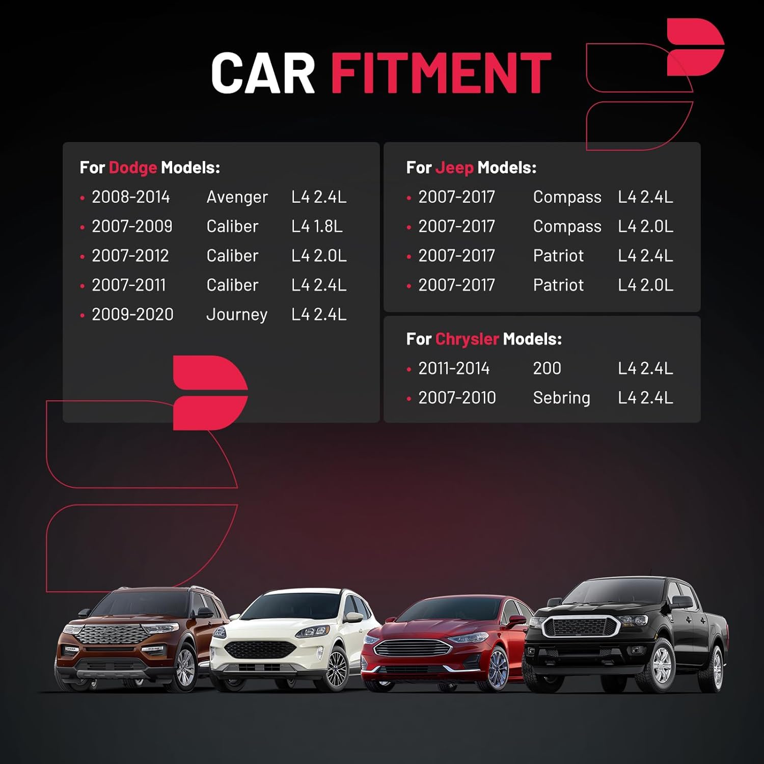 【Basic Info:】Ignition Coil UF557 & Spark Plug 2262 are compatible with Chrysler 200 Sebring, Compatible with Dodge Avenger Caliber Journey, Compatible with Jeep Compass Patriot. Please check detail fitting info from pics or detail page. OE checking is necessary before buying.