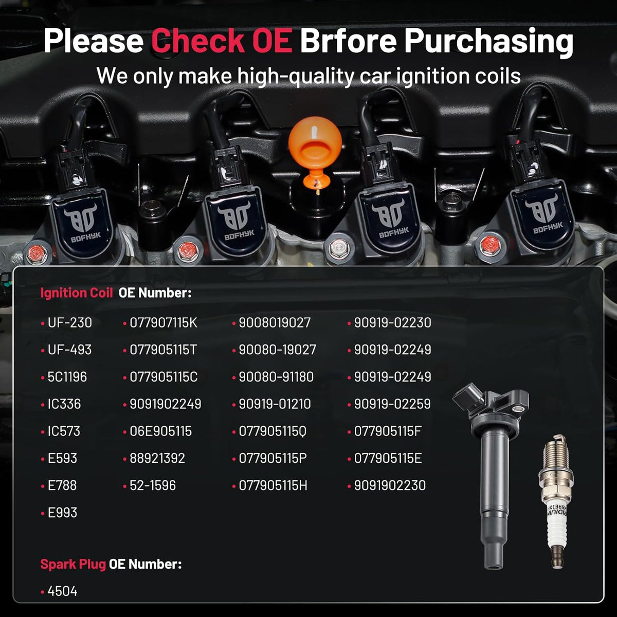 【Yes, you need a new one!】If your car has been used for a long time(over 80000km) and has problems like car shaking, start-up failure, speeding up slowly, and increasing fuel consumption, you may need to change a new set of spark plugs and coil packs. BDFHYK ignition coil and spark plug can offer you a professional user experience and make your car like new. You may choose it with confidence.