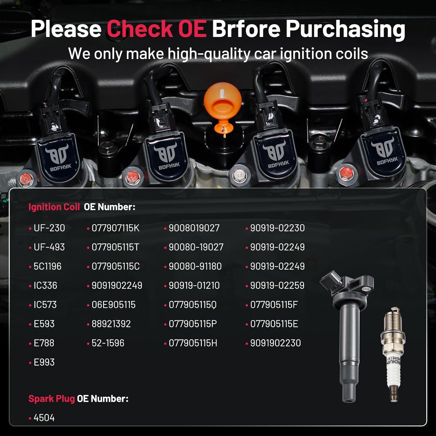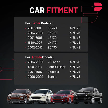 【Basic Info:】Ignition Coil UF230 & Spark Plug 4504 are compatible with Lexus GX470 LS430 LX470 SC430, Compatible with Toyota 4Runner Land Cruiser Sequoia Tundra. Please check detail fitting info from pics or detail page. OE checking is necessary before buying. 12 months warranty and lifetime after-sales service are furnished after buying our products. Please choose a suitable one with confidence.