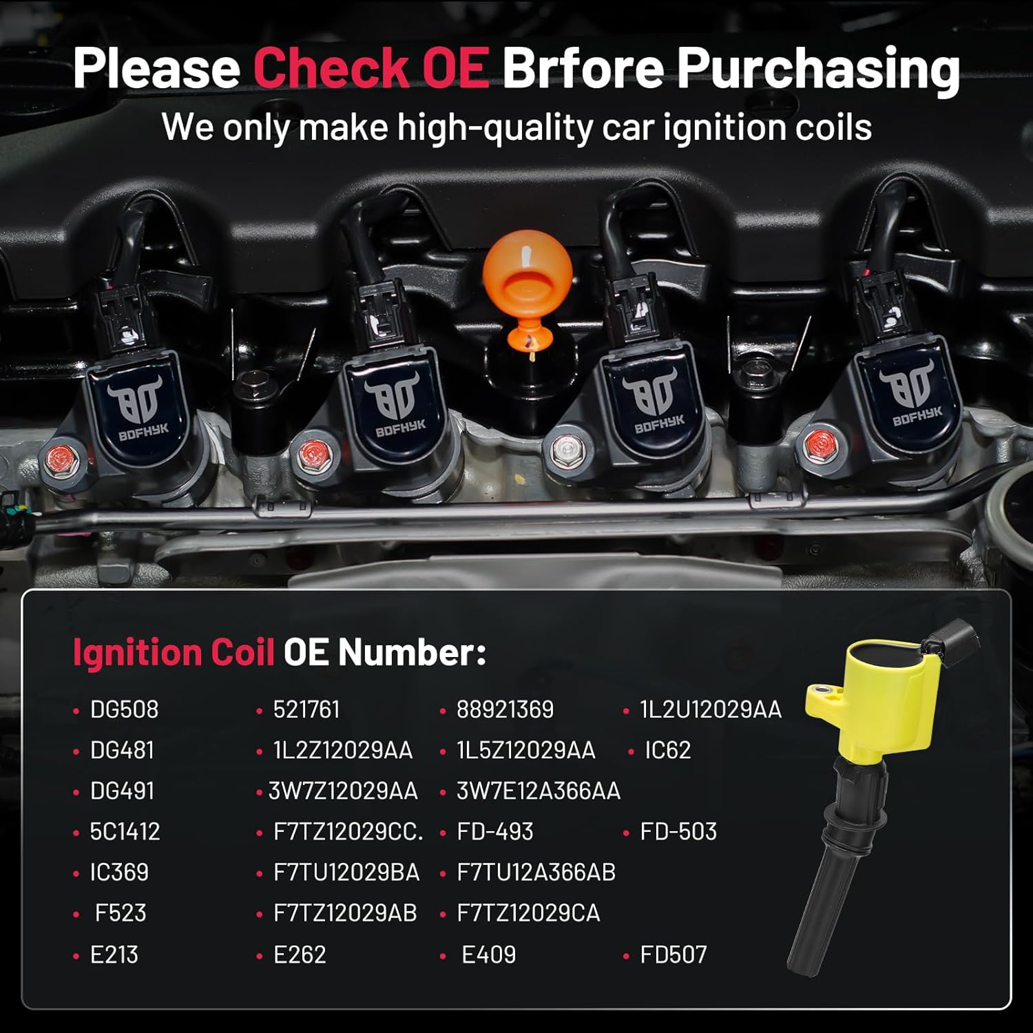 【Compatible OEM Part Numbers:】Coil packs compatible to DG508, DG481, DG491, E213, E262, E409, F523, 521761, 88921369, 1L2U12029AA, 1L2Z12029AA, 1L5Z12029AA, 3W7E12A366AA, 3W7Z12029AA, 5C1412, FD-493, FD-503, FD507, IC369, IC62, F7TU12029BA, F7TU12A366AB, F7TZ12029AB, F7TZ12029CA, F7TZ12029CC.