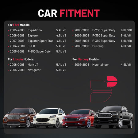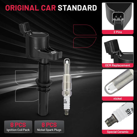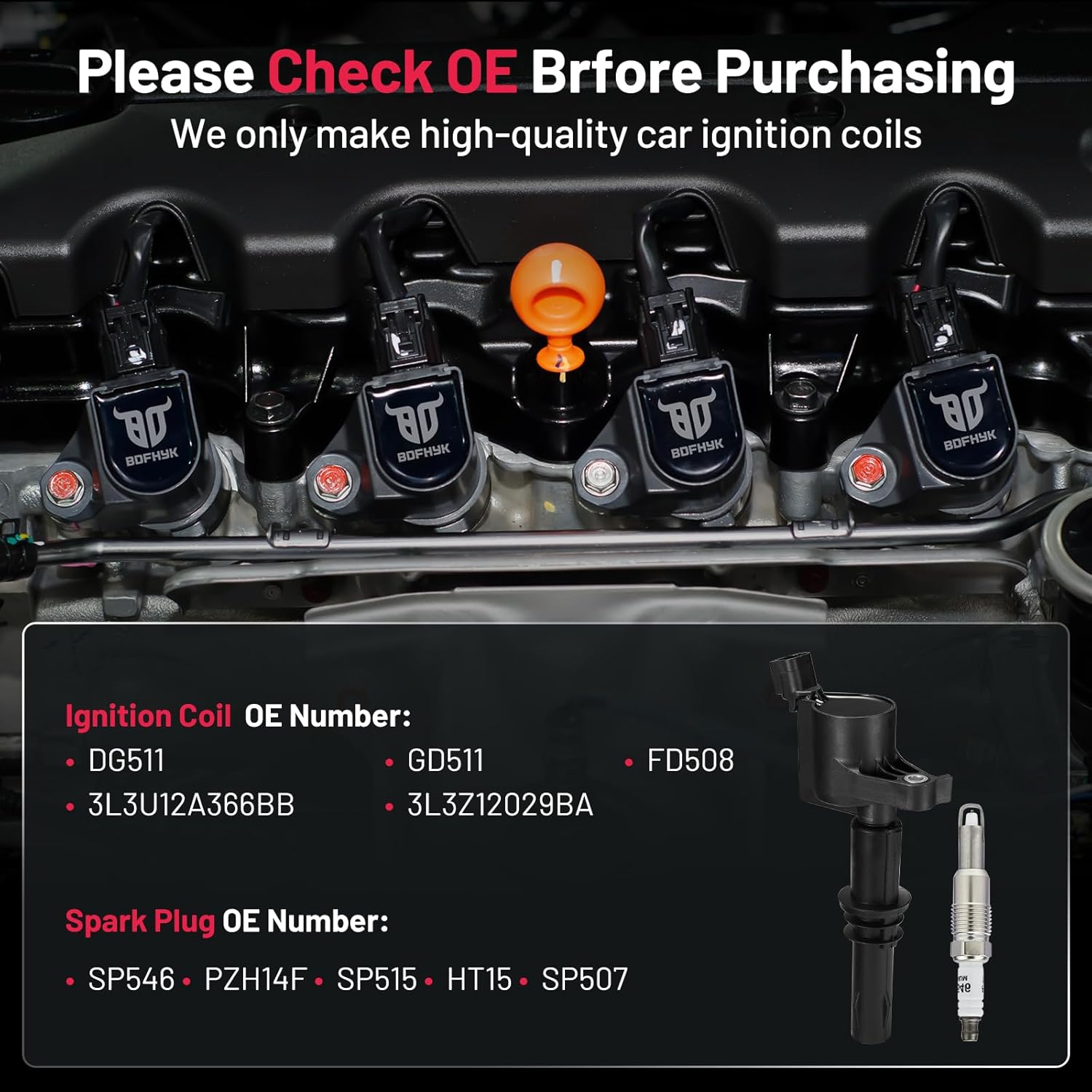 【Basic Info:】Ignition Coil DG511 & Spark Plug SP515 SP546 are Compatible with Ford F150 2004-2008, Ford F250 Super Duty 2005-2008, Ford Mustang 2005-2008, Ford Expedition 2005-2008, Compatible with Lincoln Navigator 2005-2008, Compatible with Mercury Mountaineer 2006-2008.ect. Please check detail fitting info from pics or detail page. OE checking is necessary before buying.
