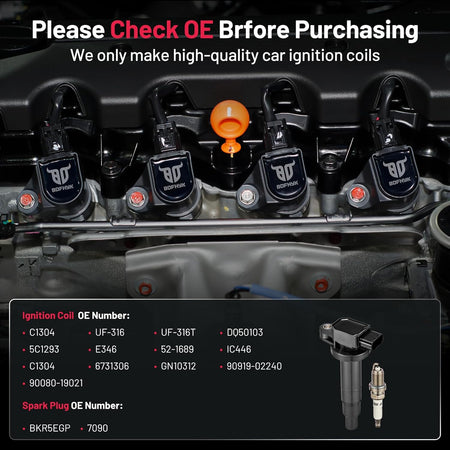 【Features of ignition coil:】High quality coil packs are made of silicon steel material, Japan-imported rubber, and Germany-imported varnished wire, which makes our products have a long using life and better quality. ‼Please check OE: C1304,UF-316,UF-316T,DQ50103,5C1293,E346,52-1689,IC446,90919-02240,C1304,90080-19021,6731306,GN10312.
