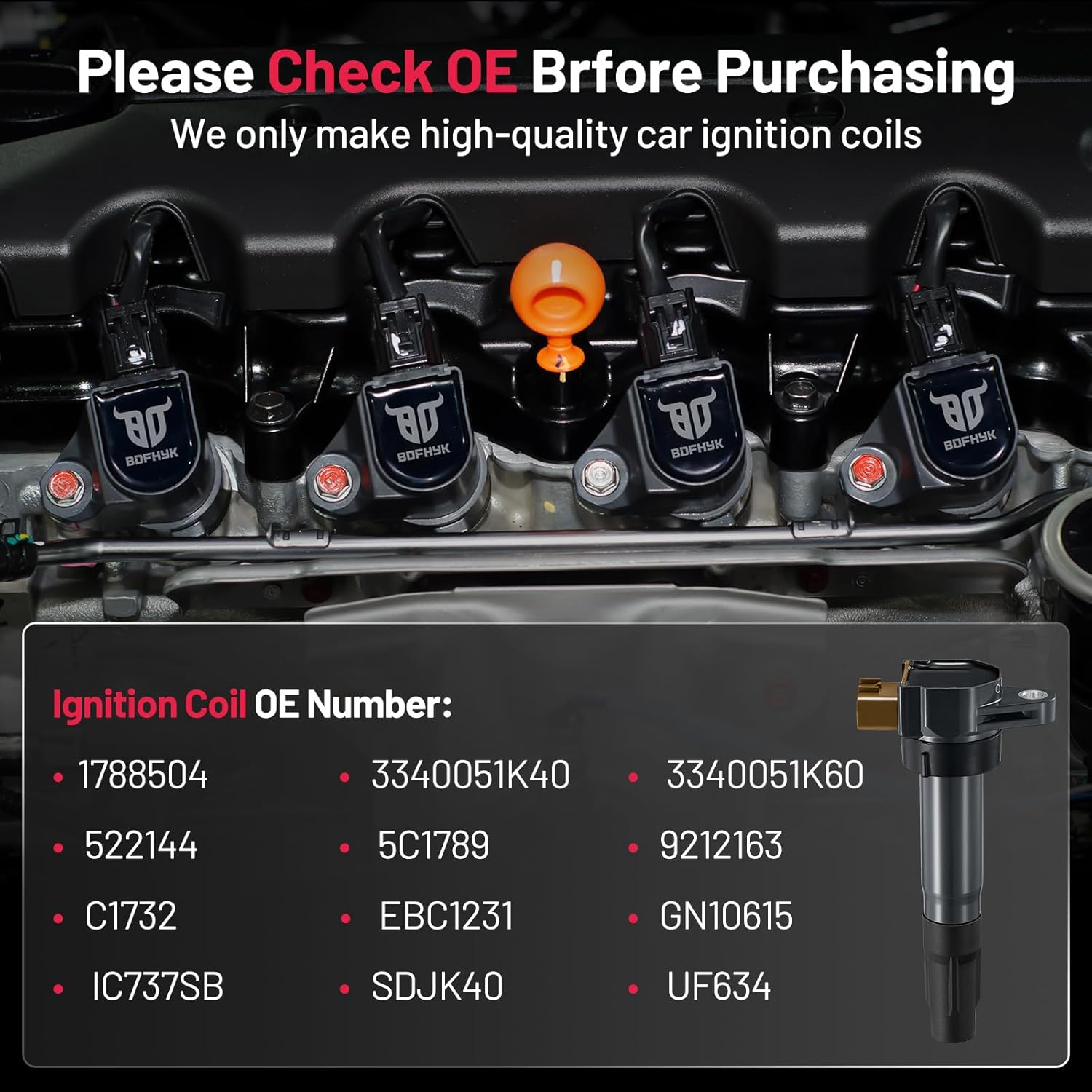 【Coils Features】:OE Standard Performance & Durability TS16949 Certified Manufacturer.Made of high grade materials such as Germany imported PBT and U.S. domestic PPO to enhance the heat resistant, Abrasion resistant, Corrosion resistant and prolong life of the coil. Strict quality control and extreme conditions are tested to ensure that the coil can output high voltage stably.