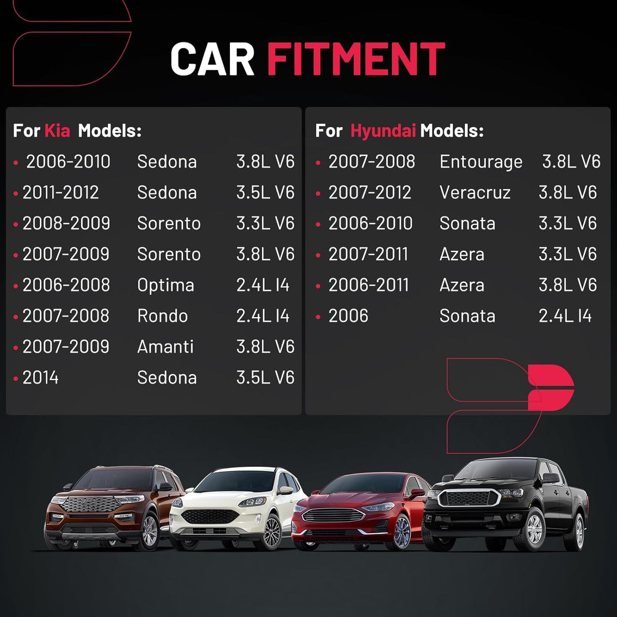 【Basic Info:】Ignition Coil UF-546 & Spark Plug 7090 are compatible with Hyundai 2006-2011 Azera,2007-2008 Entourage,2006-2010 Sonata,2007-2012 Veracruz, Compatible with Kia 2007-2009 Amanti,2006-2008 Optima,2007-2008 Rondo,2014 & 2006-2012 Sedona,2007-2009 Sorento. Please check detail fitting info from pics or detail page. OE checking is necessary before buying. Lifetime after sales service are furnished after bought our products. Please choose suitable one with confidence.