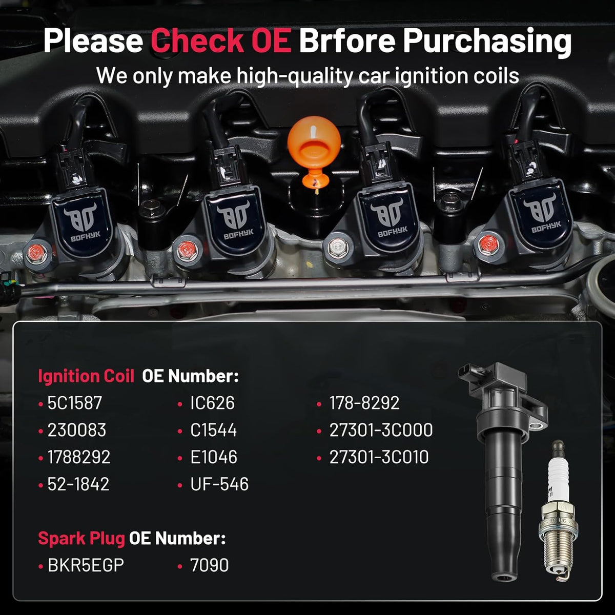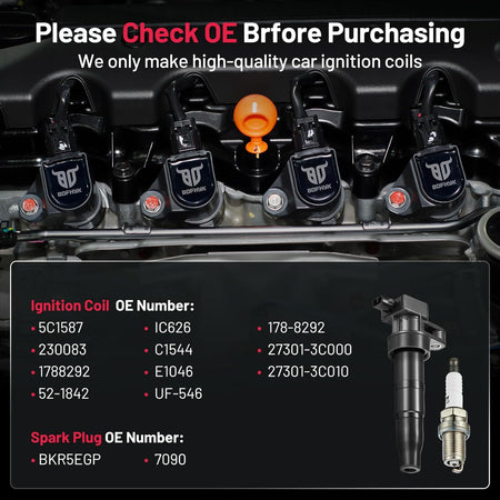 【Yes, you need a new one!】If your car has been used for a long time(over 80000km) and has problems like car shaking, start-up failure, speeding up slowly, and increasing fuel consumption, you may need to change a new set of spark plugs and coil packs. BDFHYK ignition coil and spark plug can offer you a professional user experience and make your car like new. You may choose it with confidence.