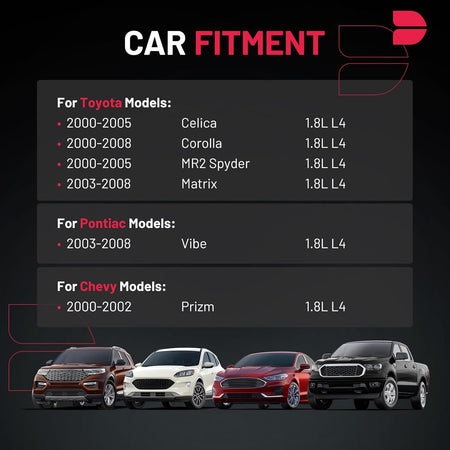 【Basic Info:】Ignition Coil UF247 & Spark Plug 4503 are Compatible with Toyota Corolla 2000-2008, Toyota Celica 2000-2005, Toyota Matrix 2003-2008, Toyota MR2 Spyder 2000-2005, Compatible with Pontiac Vibe 2003-2008, Compatible with Chevrolet Prizm 2000-2002.ect. Please check detail fitting info from pics or detail page. OE checking is necessary before buying.