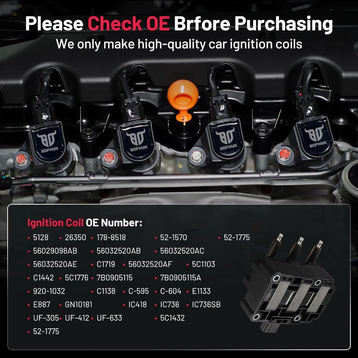 【Compatible Part Numbers】:Coil packs compatible to 5128 26350 178-8518 52-1570 52-1775 56029098AB 56032520AB 56032520AC 56032520AE 56032520AF 5C1103 5C1432 5C1776 7B0905115 7B0905115A 920-1032 C1138 C1442 C1719 C-595 C-604 E1133 E887 GN10181 IC418 IC736 IC736SB UF-305 UF-412 UF-633.
