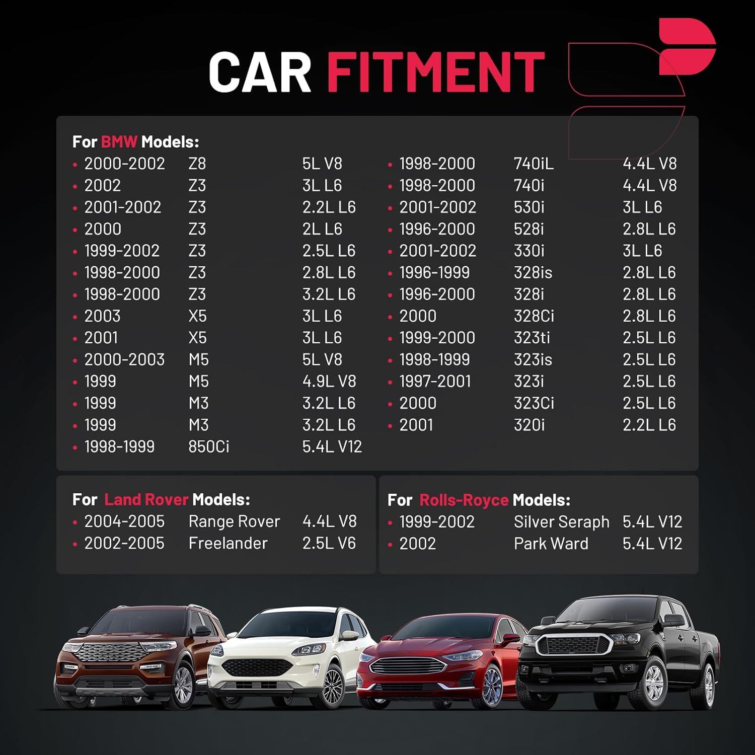 【Precautions for Purchase】:Compatible with BMW M5 1999-2003, X5 2001 2003, 330i 2001-2002, 530i 2001-2002, Z3 1998-2002, Z8 2000-2002, 320i 2001, 323i 1997-2001, X5 2001, 323Ci 2000, 323ti 1999-2000, 328Ci 2000, 328i 1996-2000, 528i 1996-2000, 740i 1998-2000, 740iL 1998-2000, 323is 1998-1999, 328is 1996-1999, 850Ci 1998-1999,M3 1999; Compatible with Land Rover Freelander 2002-2005, Range Rover 2004-2005; Compatible with Rolls-Royce Park Ward 2002, Silver Seraph 1999-2002