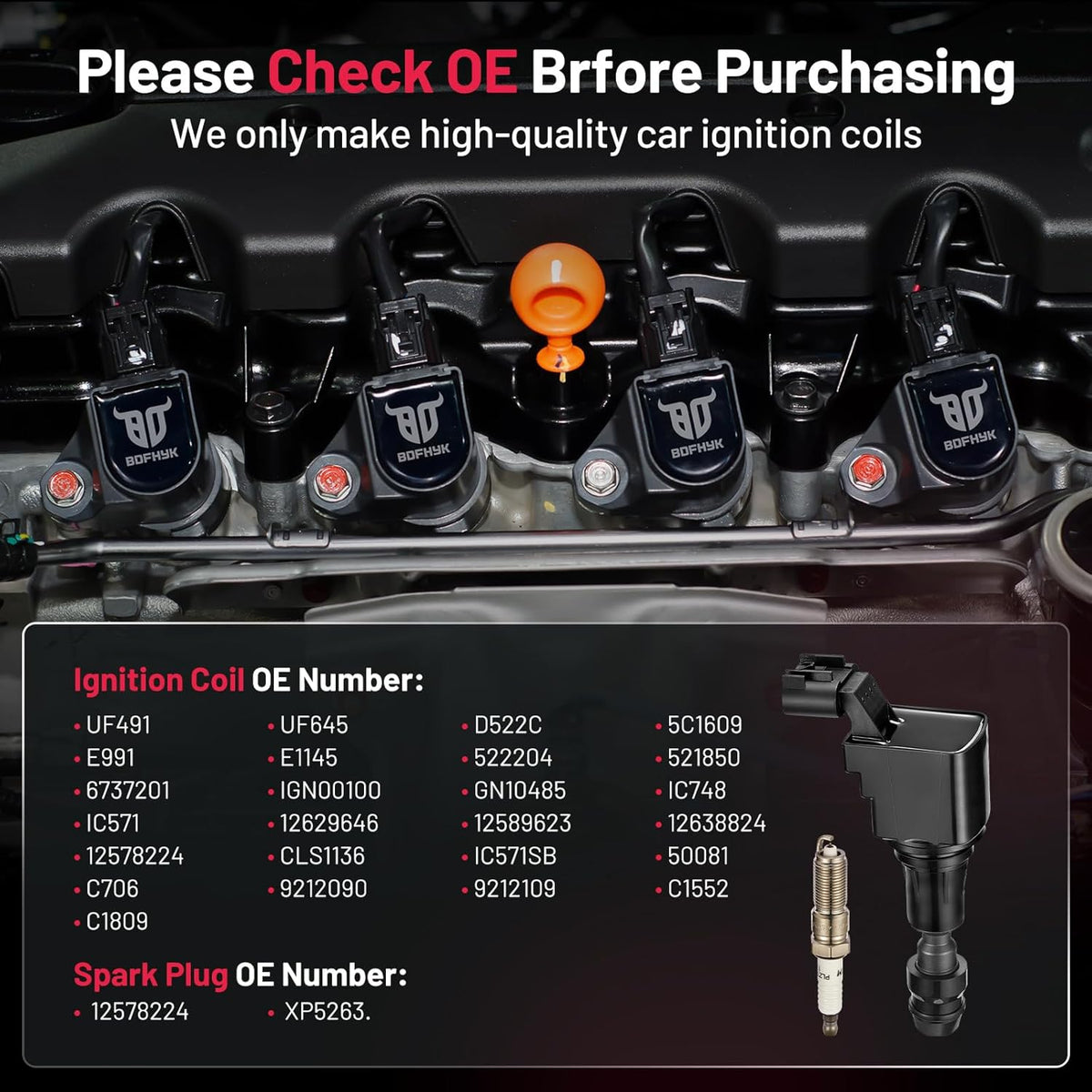 【Features of ignition coil:】High quality coil packs are made of silicon steel material, Japan-imported rubber, and Germany-imported varnished wire, which makes our products have a long using life and better quality. ‼Please check OE:UF491,UF645,D522C,5C1609,E991,E1145,522204,521850,6737201,IGN00100,GN10485,IC748,IC571,12629646,12589623,12638824,12578224,CLS1136,IC571SB,50081,C706,9212090,9212109,C1552,C1809.