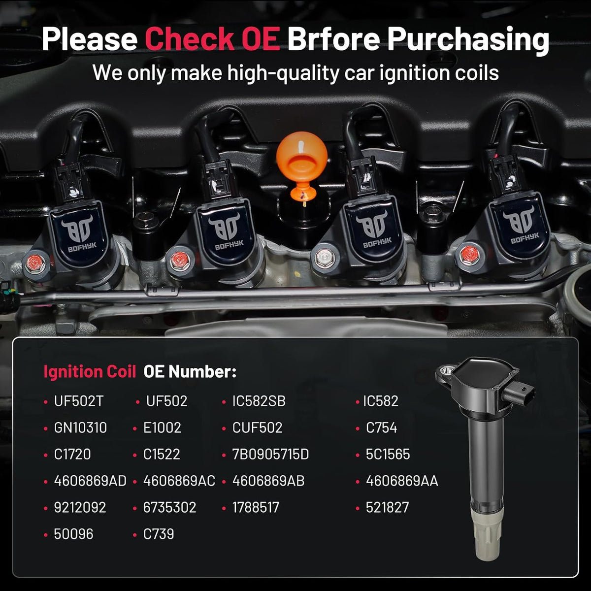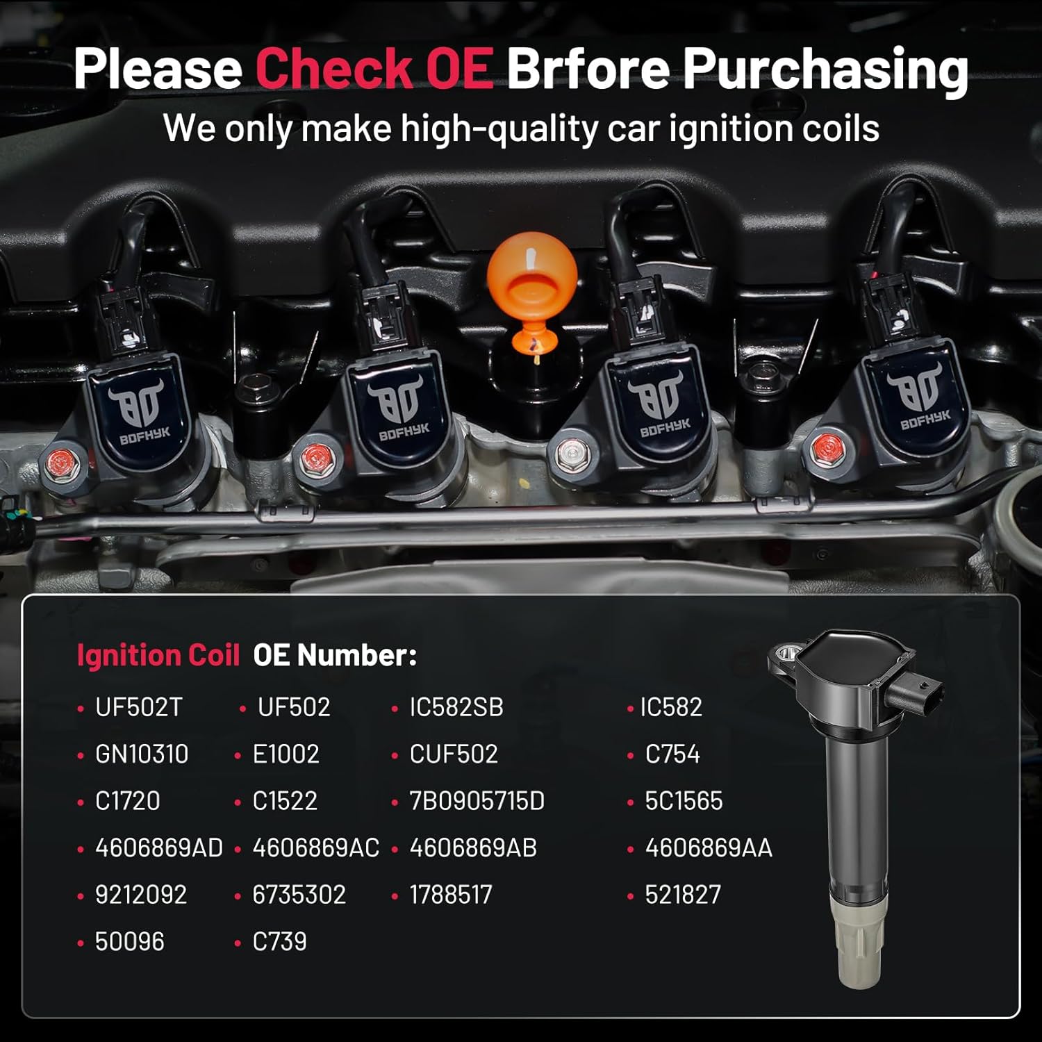 【Compatible Part Numbers】:Coil packs compatible to UF502T UF502 IC582SB IC582 GN10310 E1002 CUF502 C754 C739 C1720 C1522 7B0905715D 5C1565 4606869AD 4606869AC 4606869AB 4606869AA 9212092 6735302 1788517 521827 50096.