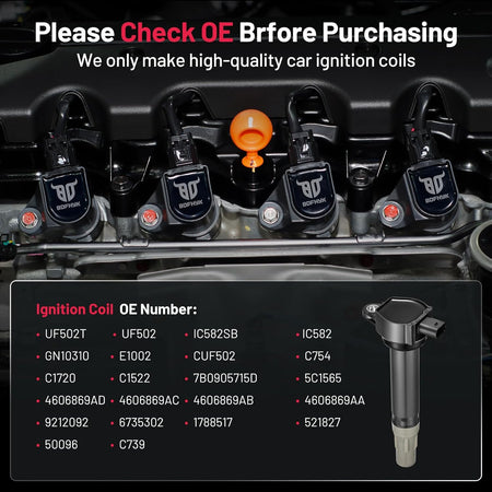 【Coils Features】:OE Standard Performance & Durability TS16949 Certified Manufacturer.Made of high grade materials such as Germany imported PBT and U.S. domestic PPO to enhance the heat resistant, Abrasion resistant, Corrosion resistant and prolong life of the coil. Strict quality control and extreme conditions are tested to ensure that the coil can output high voltage stably.