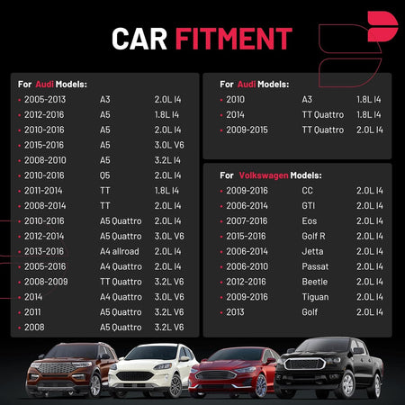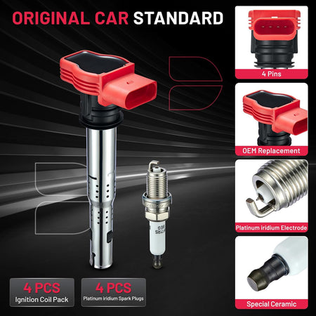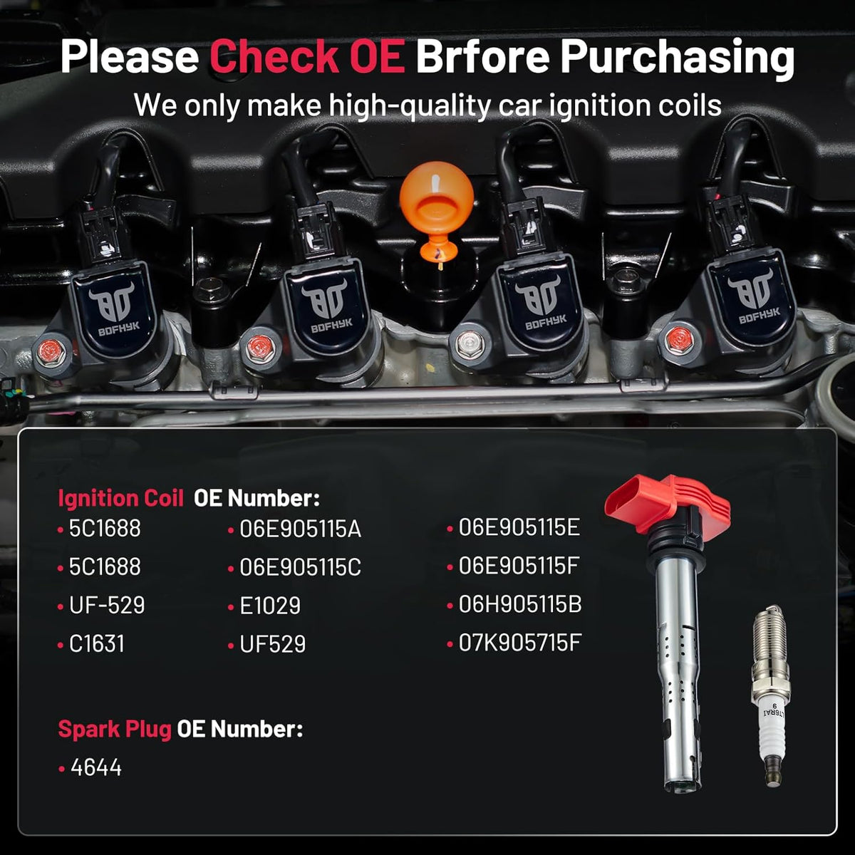 【Basic Info:】Ignition Coil UF529 & Spark Plug 4644 are compatible with Audi A3 A4 allroad Quattro A5 Quattro Q5 TT Quattro, Compatible with Vw Beetle CC Eos Golf R GTI Jetta Passat Tiguan. Please check detail fitting info from pics or detail page. OE checking is necessary before buying. Lifetime after sales service are furnished after bought our products. Please choose suitable one with confidence.