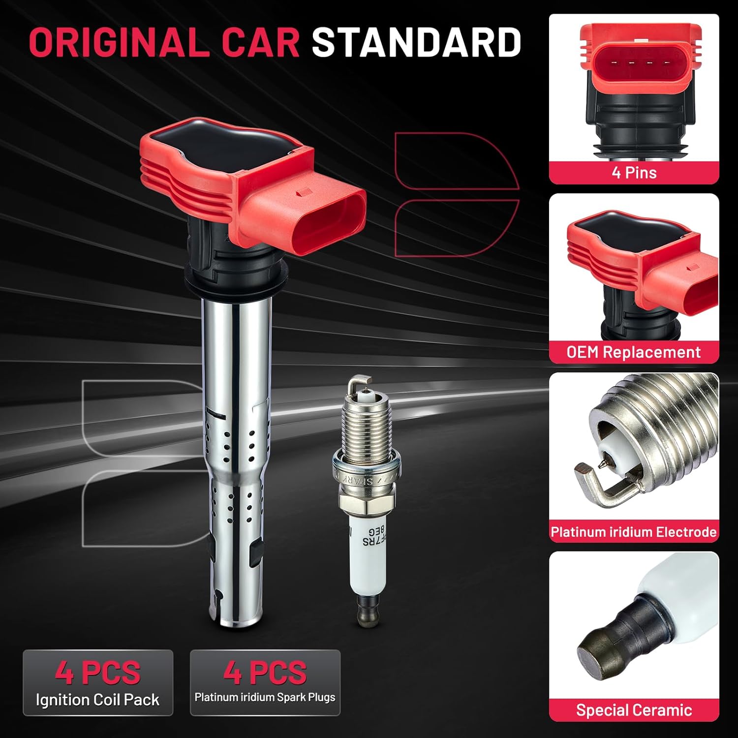 BDFHYK Ignition Coil Pack UF529 and Iridium Spark Plugs 4644 Compatible with Audi A3 A4 allroad Quattro A5 Quattro Q5 TT Quattro Volkswagen 1.8L 2.0L L4 3.0L 3.2L V6, Sets of 4