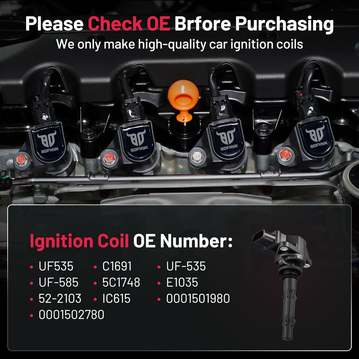 【Coils Features】:OE Standard Performance & Durability TS16949 Certified Manufacturer.Made of high grade materials such as Germany imported PBT and U.S. domestic PPO to enhance the heat resistant, Abrasion resistant, Corrosion resistant and prolong life of the coil. Strict quality control and extreme conditions are tested to ensure that the coil can output high voltage stably.
