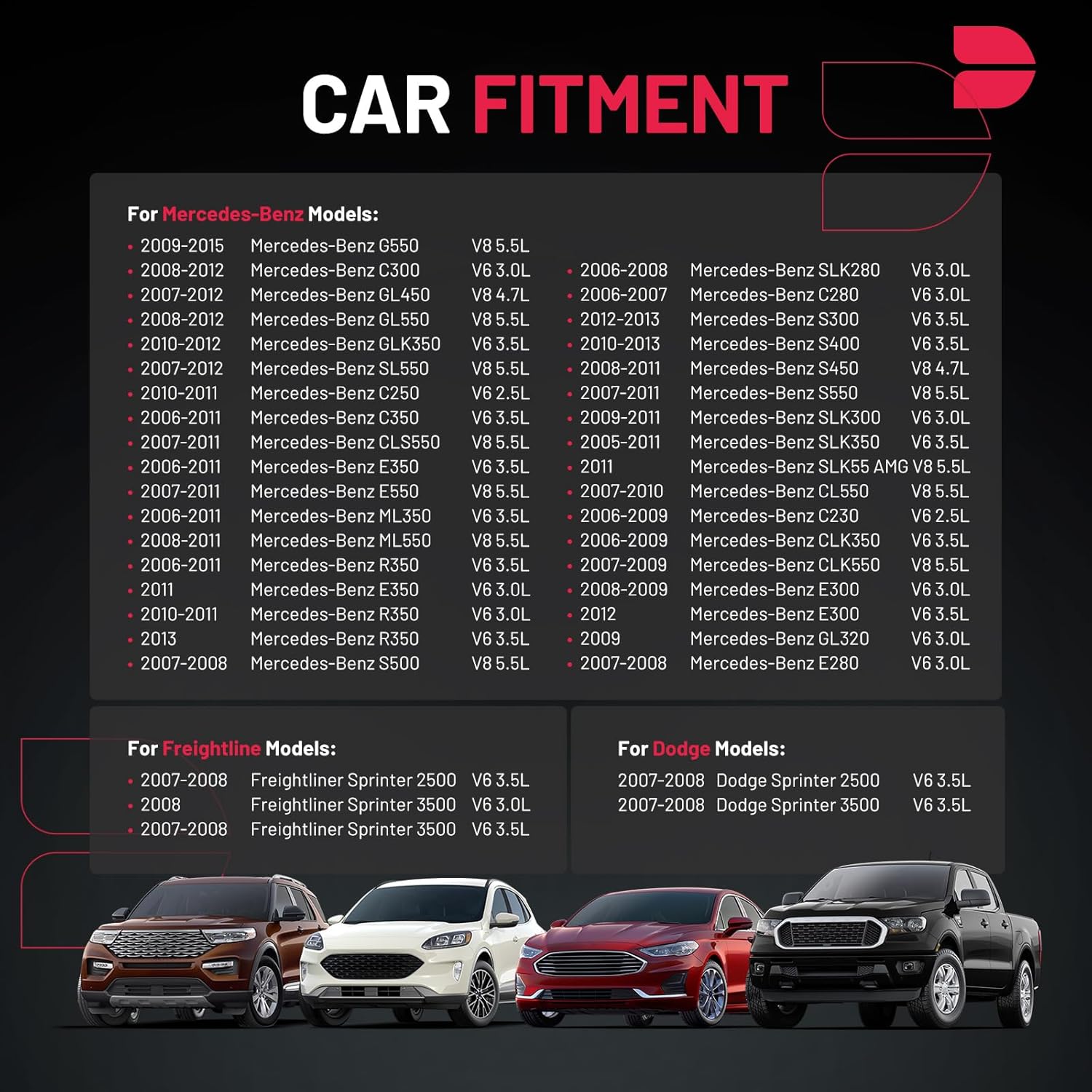 【Precautions for Purchase】Compatible with Mercedes-Benz G550 C300 GL450 GL550 GLK350 SL550 C250 C350 CLS550 E350 E550 ML350 ML550 R350 S300 S400 S450 S550 SLK300 SLK350 SLK55 AMG CL550 C230 CLK350 CLK550 E300 GL320 E280 S500 SLK280 C280; Compatible with Dodge Sprinter 2500 3500,Compatible with Freightliner Sprinter 2500 3500.Please confirm the compatibility according to the year/make/model of your vehicle and the OE number of the replaceable part.