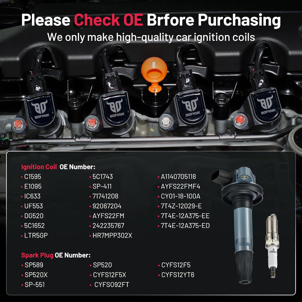 【Yes, you need a new one!】If your car has been used for a long time(over 80000km) and has problems like car shaking, start-up failure, speeding up slowly, and increasing fuel consumption, you may need to change a new set of spark plugs and coil packs. BDFHYK ignition coil and spark plug can offer you a professional user experience and make your car like new. You may choose it with confidence.