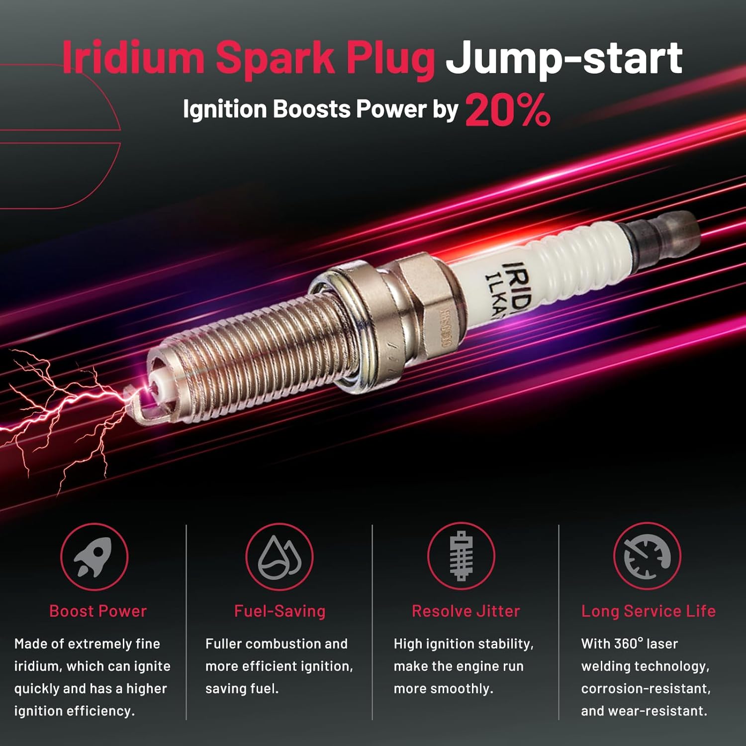 【Features of spark plug:】Professional spark plugs is made of high-tech materials. We choose iridium electrode and unique ceramic to make sure your car can have a new life after being installed. The car will start quickly and speed up in a short time as powerful as a new car. ‼Please check OE:LKAR7BIX-11S, 93501.