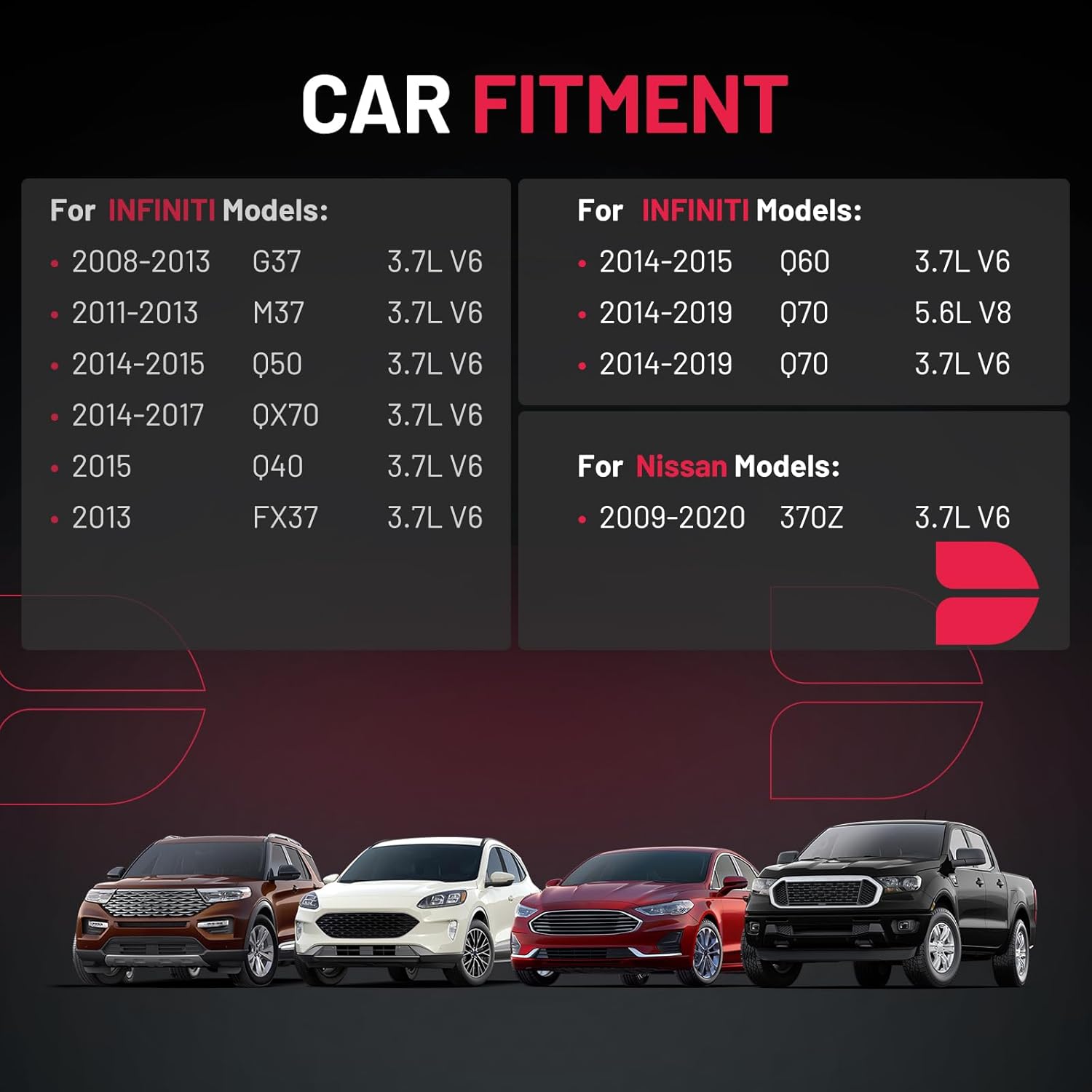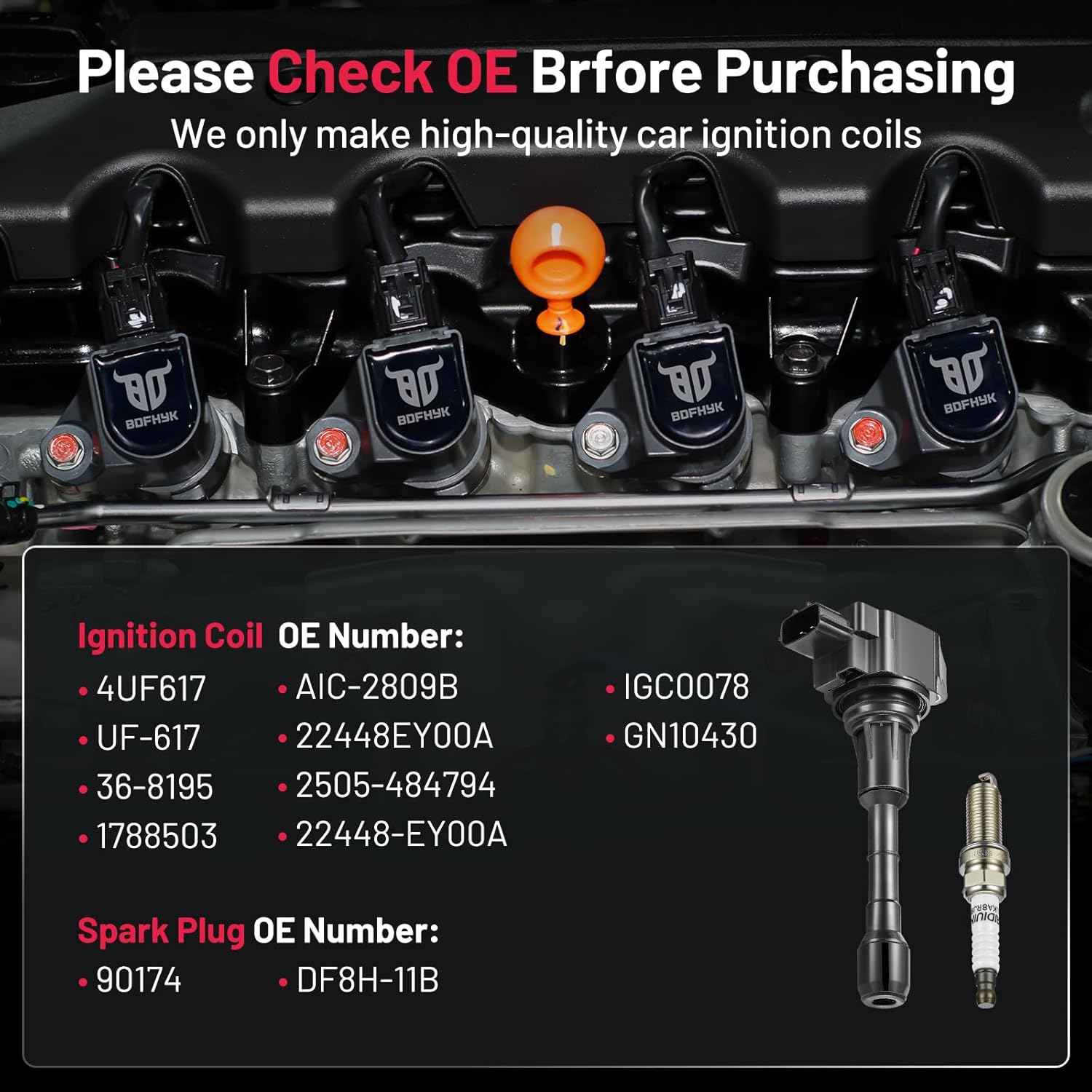 【Basic Info:】Ignition Coil UF617 & Spark Plug 90174 are compatible with INFINITI 2013 FX37,2008-2013 G37,2011-2013 M37,2015 Q40,2014-2015 Q50,2014-2015 Q60,2014-2019 Q70,2014-2017 QX70,Compatible with Nissan 2009-2020 370Z. Please check detail fitting info from pics or detail page. OE checking is necessary before buying. 12 months warranty and lifetime after sales service are furnished after bought our products. Please choose suitable one with confidence.