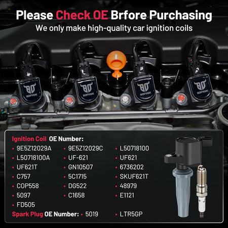 【Features of ignition coil:】High quality ignition coils are made of silicon steel material, Japan-imported rubber, and Germany-imported varnished wire, which makes our products have a long using life and better quality. ‼Please check OE:9E5Z12029A 9E5Z12029C L50718100 L50718100A UF-621 UF621 UF621T GN10507 6736202 C757 5C1715 SKUF621T 5C1715 COP558 DG522 48979 5097 C1658 E1121 FD505.