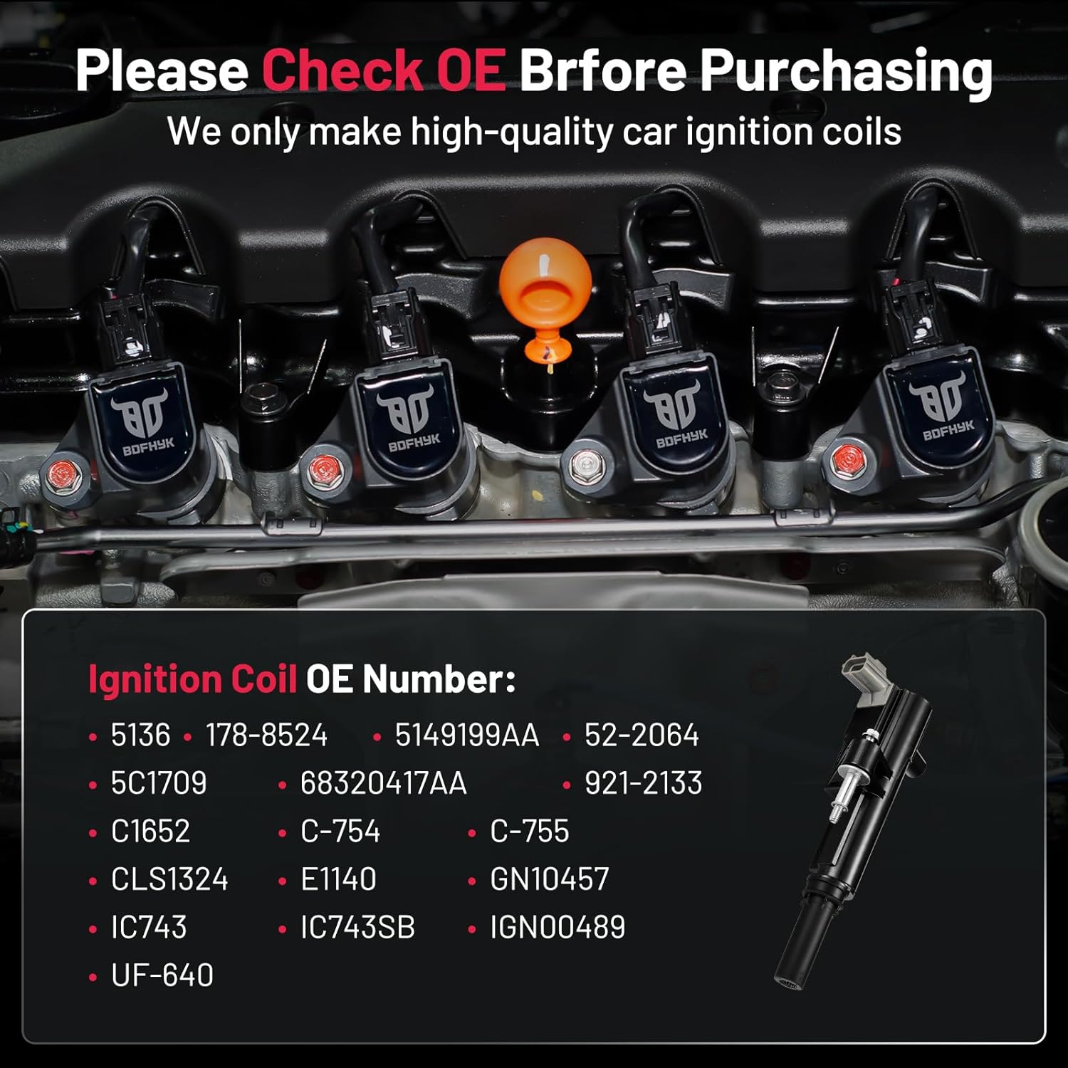 【Compatible Part Numbers】:Coil packs compatible to 5136 178-8524 5149199AA 52-2064 5C1709 68320417AA 921-2133 C1652 C-754 C-755 CLS1324 E1140 GN10457 IC743 IC743SB IGN00489 UF-640.