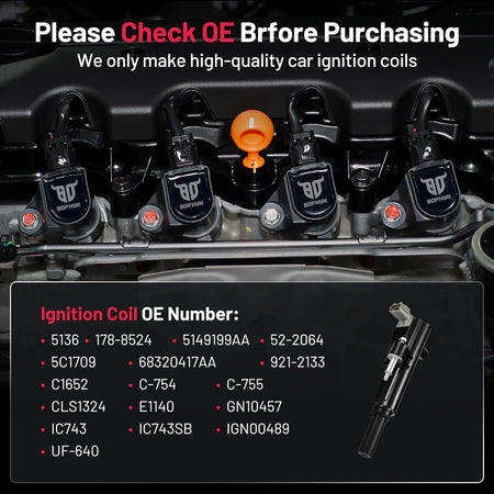 【Coils Features】:OE Standard Performance & Durability TS16949 Certified Manufacturer.Made of high grade materials such as Germany imported PBT and U.S. domestic PPO to enhance the heat resistant, Abrasion resistant, Corrosion resistant and prolong life of the coil. Strict quality control and extreme conditions are tested to ensure that the coil can output high voltage stably.