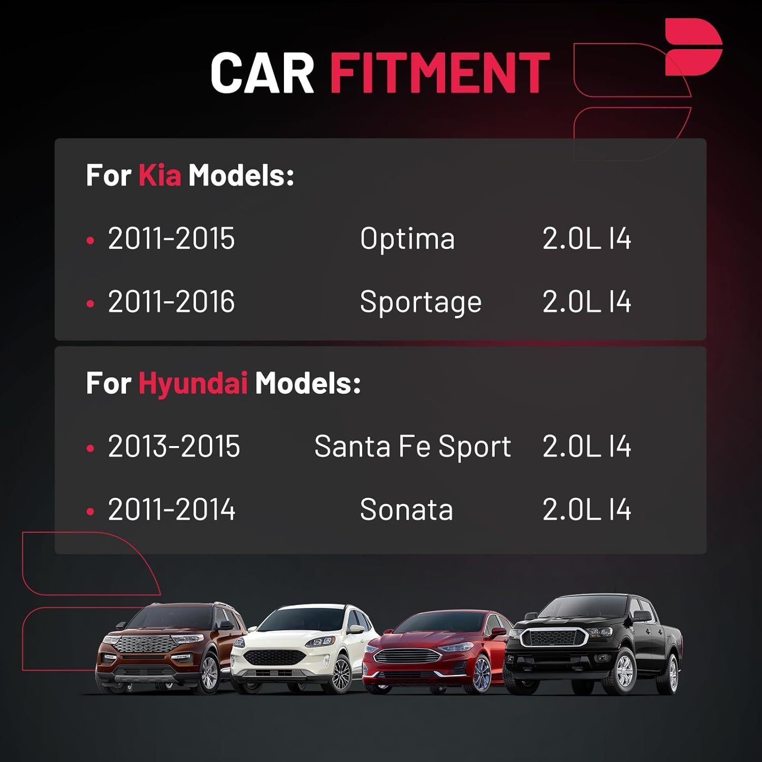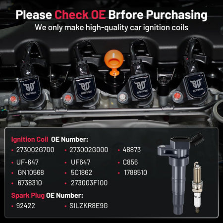 【Basic Info:】Ignition Coil UF647 & Spark Plug 92422 Compatible with Kia 2011-2015 Optima, 2011-2016 Sportage; Compatible with Hyundai 2013-2015 Santa Fe Sport, 2011-2014 Sonata. Please check detail fitting info from pics or detail page. OE checking is necessary before buying.