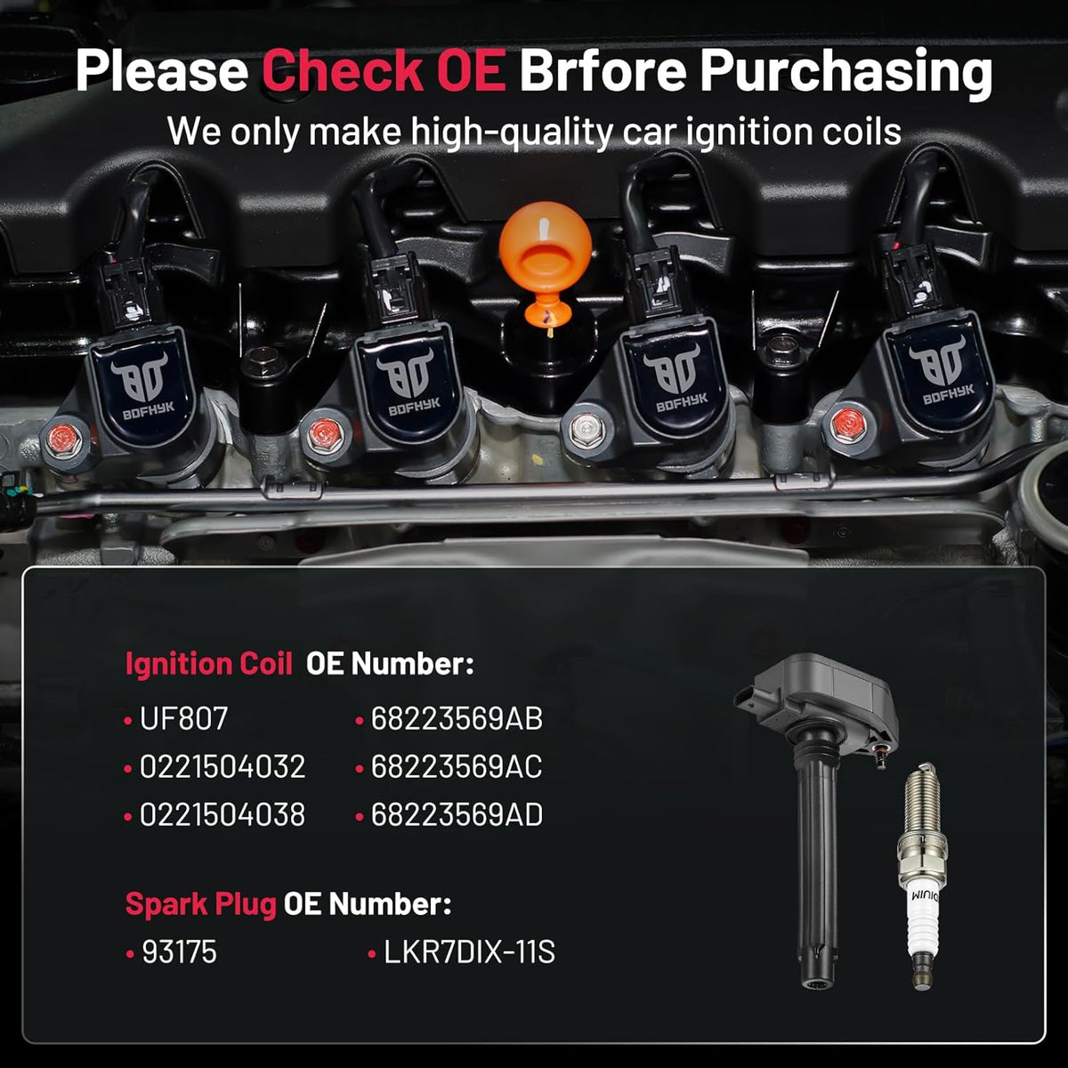 【Features of ignition coil:】High quality ignition coils are made of silicon steel material, Japan-imported rubber, and Germany-imported varnished wire, which makes our products have a long using life and better quality. ‼Please check OE:UF807 0221504032 0221504038 68223569AB 68223569AC 68223569AD.