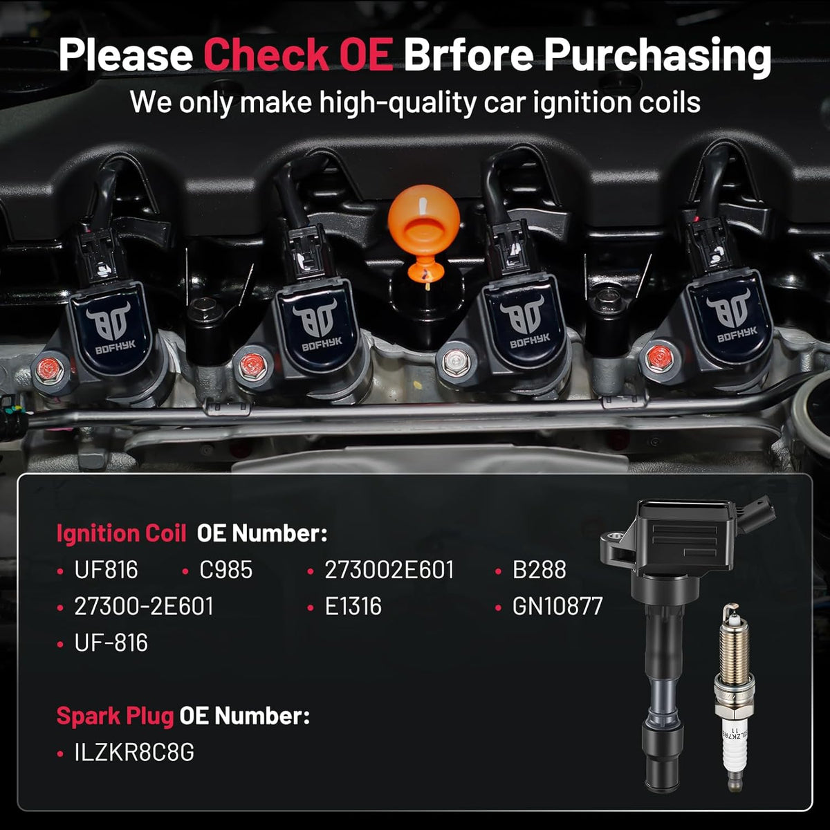 【Yes, you need a new one!】If your car has been used for a long time(over 80000km) and has problems like car shaking, start-up failure, speeding up slowly, and increasing fuel consumption, you may need to change a new set of spark plugs and coil packs. BDFHYK ignition coil and spark plug can offer you a professional user experience and make your car like new. You may choose it with confidence.