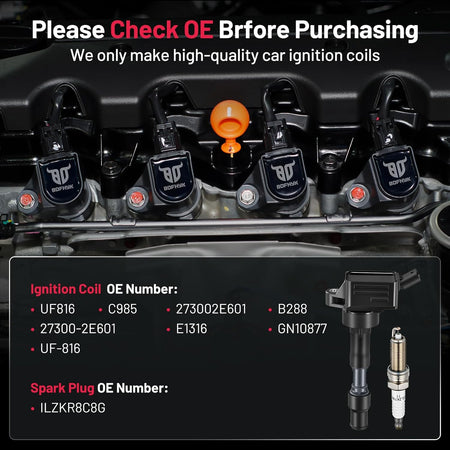 【Basic Info:】Ignition Coil UF816 & Spark Plug ILZKR8C8G are Compatible with Hyundai 2018-2020 Kona, 2019-2020 Veloster, 2017-2020 Elantra, Compatible with Kia 2018-2020 Forte, 2020 Soul. Please check detail fitting info from pics or detail page. OE checking is necessary before buying. Lifetime after sales service are furnished after bought our products. Please choose suitable one with confidence.
