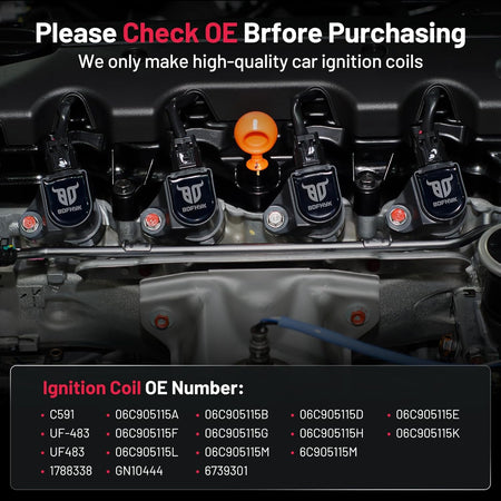 【OE Standard Performance】Exquisite craftsmanship design, 100% brand new high quality ignition coil pack, OE grade durability, bring you ultimate comfortable driving experience.OE No.06C905115A 06C905115B 06C905115D 06C905115E 06C905115F 06C905115G 06C905115H 06C905115K 06C905115L 06C905115M 6C905115M UF-483 UF483 GN10444 6739301 C591 1788338.