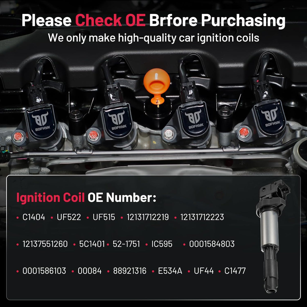 【OE Standard Performance】Exquisite craftsmanship design, 100% brand new high quality ignition coil pack, OE grade durability, bring you ultimate comfortable driving experience.OE No.C1404 UF522 UF515 12131712219 12131712223 12137551260 5C1401 52-1751 IC595 C1477 0001584803 0001586103 00084 88921316 E534A UF44.