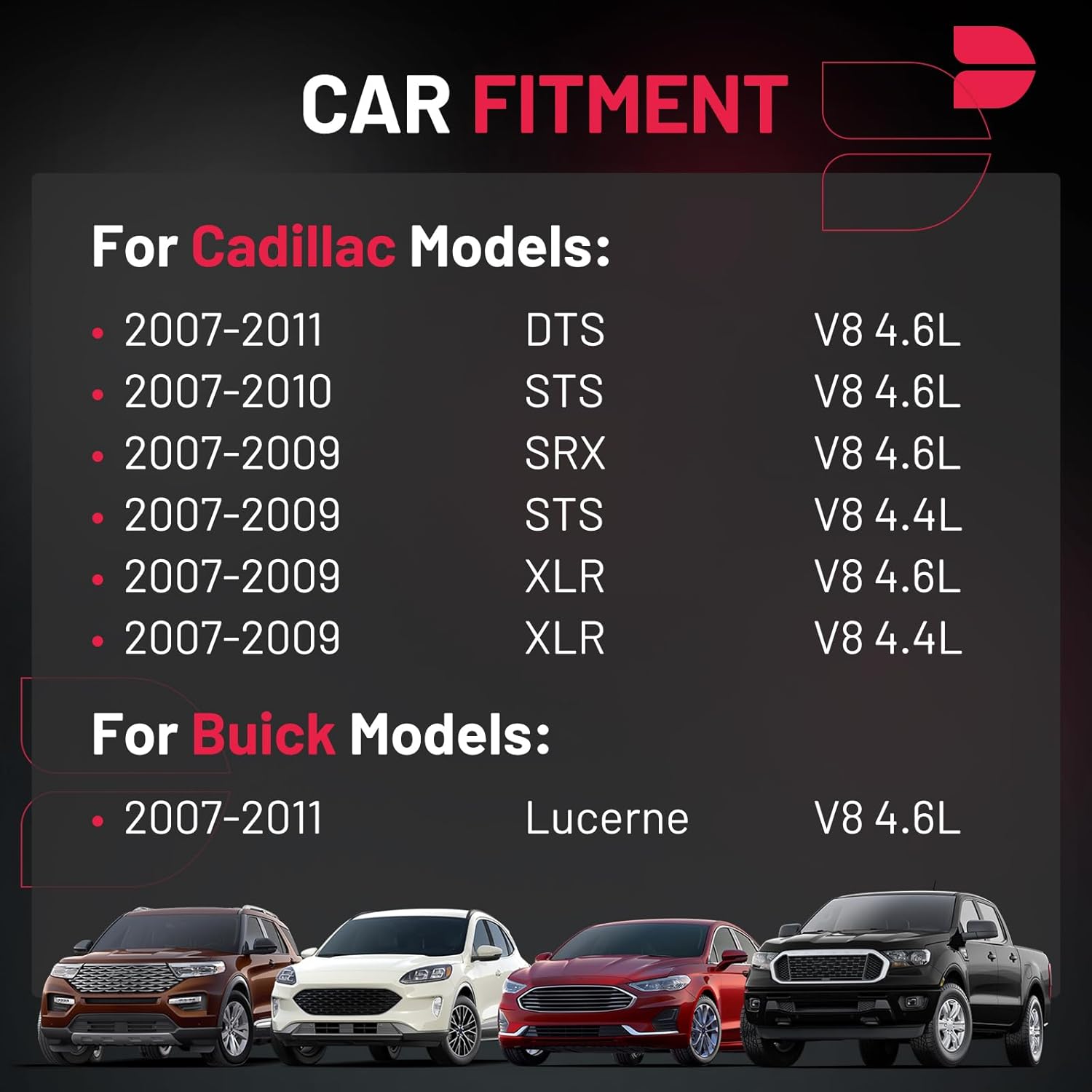 【Compatible with】Please confirm compatibility based on your vehicle's year, brand, model, and the OE number of the replacement coils. Ignition coils Compatible with Buick 2007-2011 Lucerne V8 4.6L; Compatible with Cadillac 2007-2011 DTS V8 4.6L, 2007-2010 STS V8 4.6L 4.4L, 2007-2009 SRX V8 4.6L, 2007-2009 XLR V8 4.6L 4.4L. More information can be found in the pictures or on the details page.