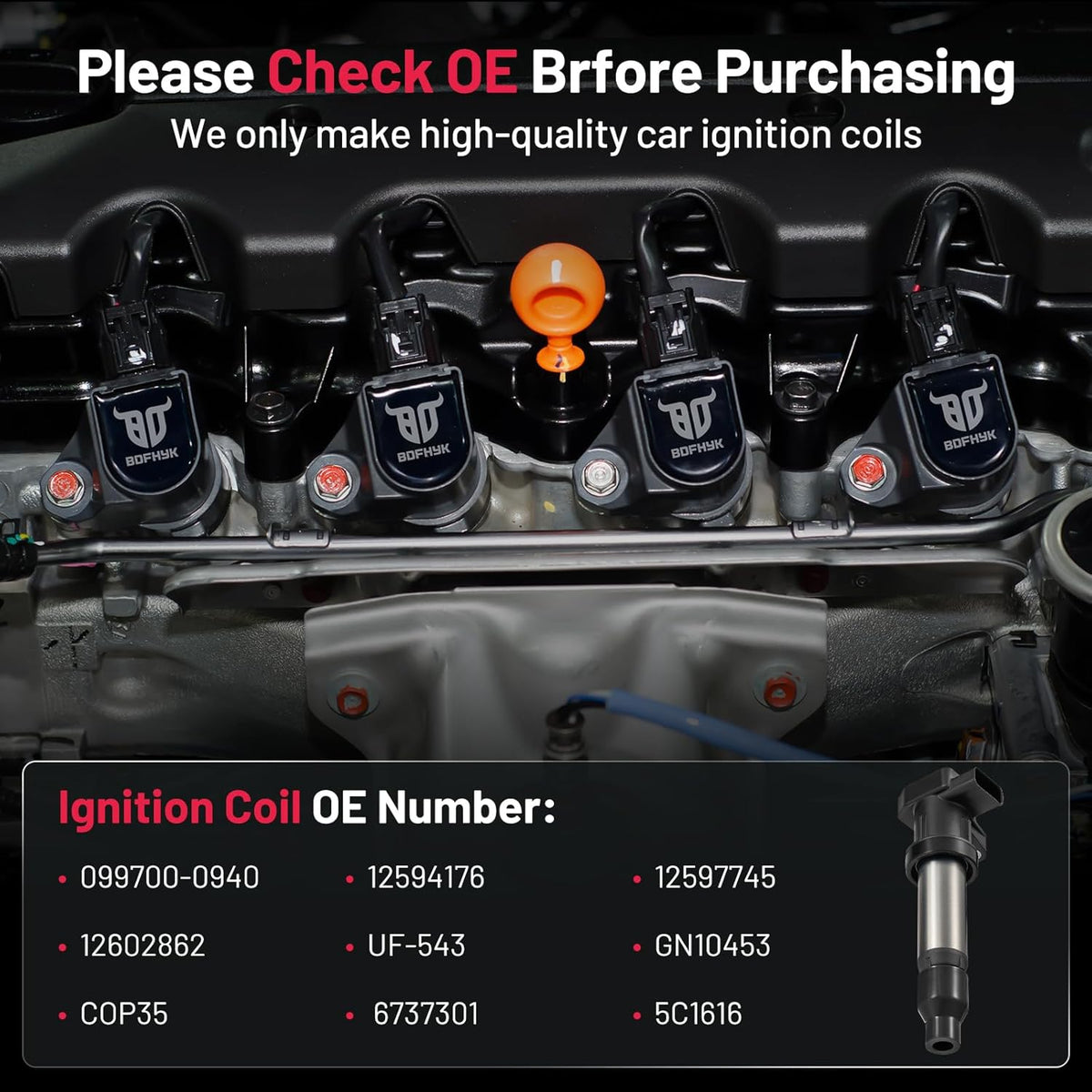 【OE Standard Performance】Exquisite craftsmanship design, 100% brand new high quality ignition coil pack, OE grade durability, bring you ultimate comfortable driving experience.OE No. 099700-0940 12594176 12597745 12602862 UF-543 GN10453 COP35 6737301 5C1616.