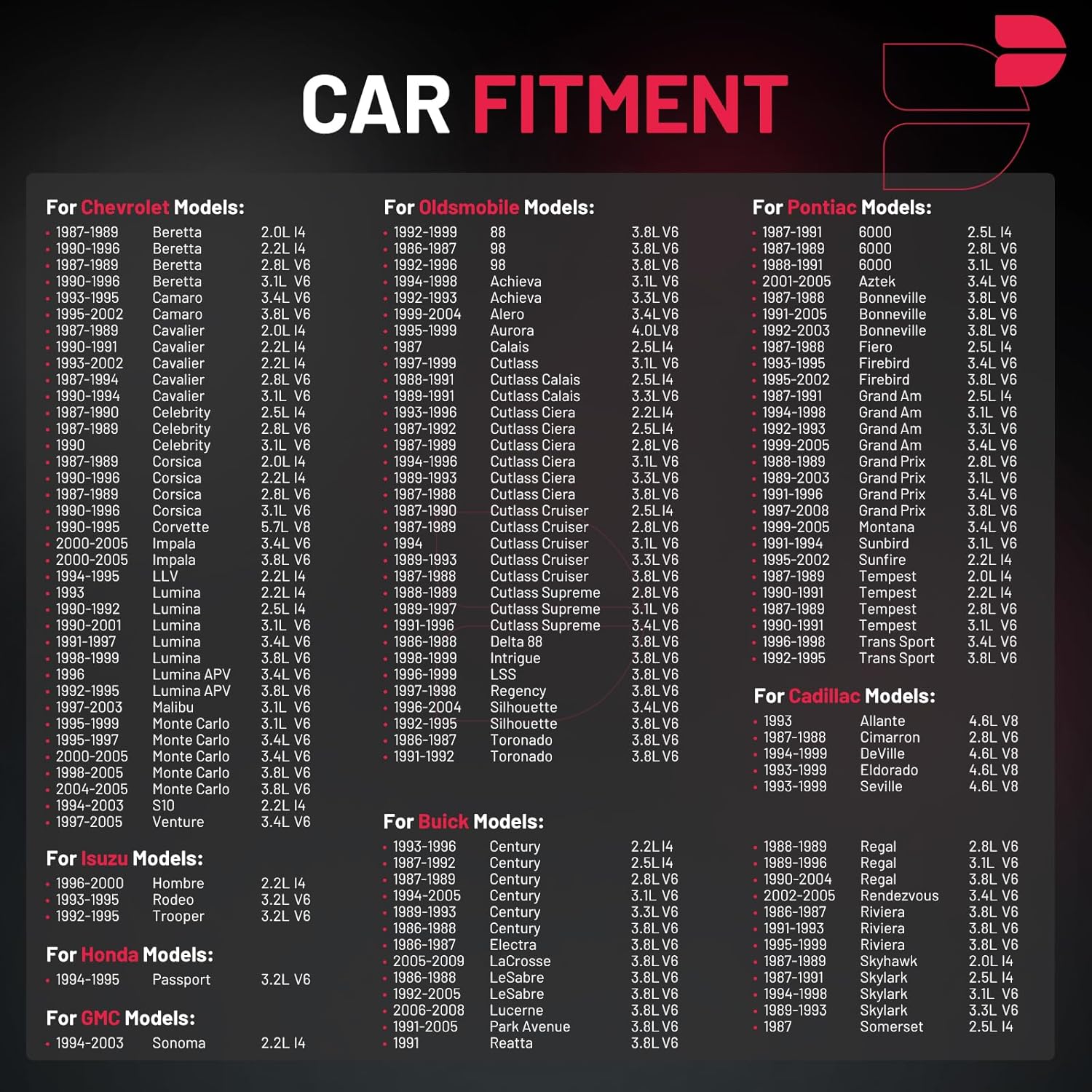 【Compatible with】Ignition coils Compatible with Buick Century Electra LaCrosse LeSabre Lucerne Park Avenue Reatta Regal Rendezvous Riviera; Compatible with Cadillac Allante Cimarron DeVille Eldorado Seville; Compatible with Chevy Beretta Camaro Cavalier Celebrity Corsica Corvette Impala LLV Lumina Lumina APV Malibu Monte Carlo S10 Venture. More information can be found in the pictures or on the details page.
