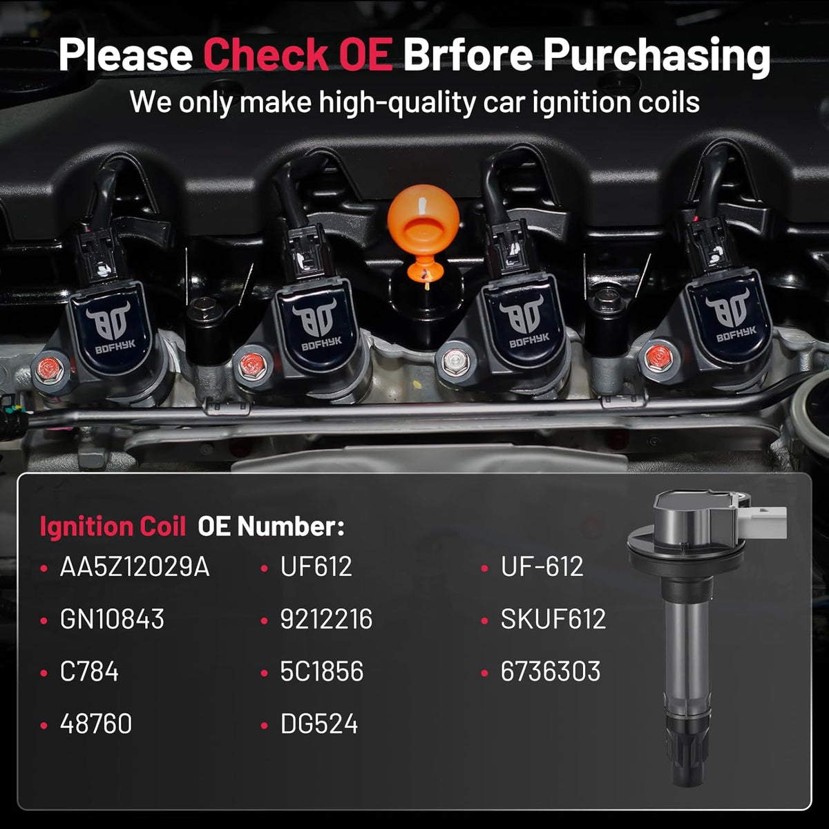 【About BDFHYK】We are a professional automotive component manufacturer with a mature industrial production line. If you encounter any issues with our ignition coil, please contact us immediately, and we will respond to you within 48 hours. We are committed to providing a 12-month quality guarantee service. Choose BDFHYK, choose high-quality coil packs.