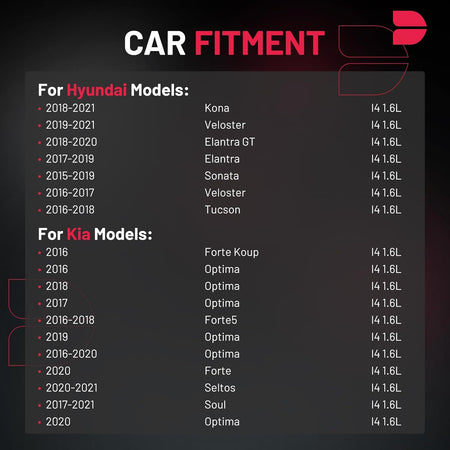 【Compatible with】Please confirm compatibility based on your vehicle's year, brand, model, and the OE number of the replacement coils.Ignition coils Compatible with Hyundai 2018-2021 Kona, 2019-2021 Veloster, 2018-2020 Elantra GT l4 1.6L, 2015-2019 Sonata l4 1.6L, 2016-2018 Tucson l4 1.6L; Compatible with Kia 2020-2021 Seltos l4 1.6L, 2017-2021 Soul l4 1.6L, 2016-2020 Optima l4 1.6L, 2016-2018 Forte Koup Forte5 l4 1.6L.More information can be found in the pictures or on the details page.