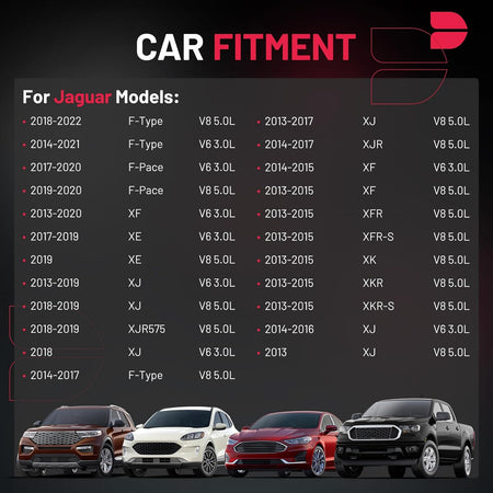 【Compatible with】Please confirm compatibility based on your vehicle's year, brand, model, and the OE number of the replacement coils.Ignition coils Compatible with Jaguar 2018-2022 F-Type V8 5.0L, 2017-2020 F-Pace V6 3.0L, 2013-2020 XF XE XJ XK V6 3.0L, 2018-2019 XJR XJR575 V8 5.0L, 2013-2015 XFR XFR-S V8 5.0L, 2013-2015 XKR XKR-S V8 5.0L.More information can be found in the pictures or on the details page.